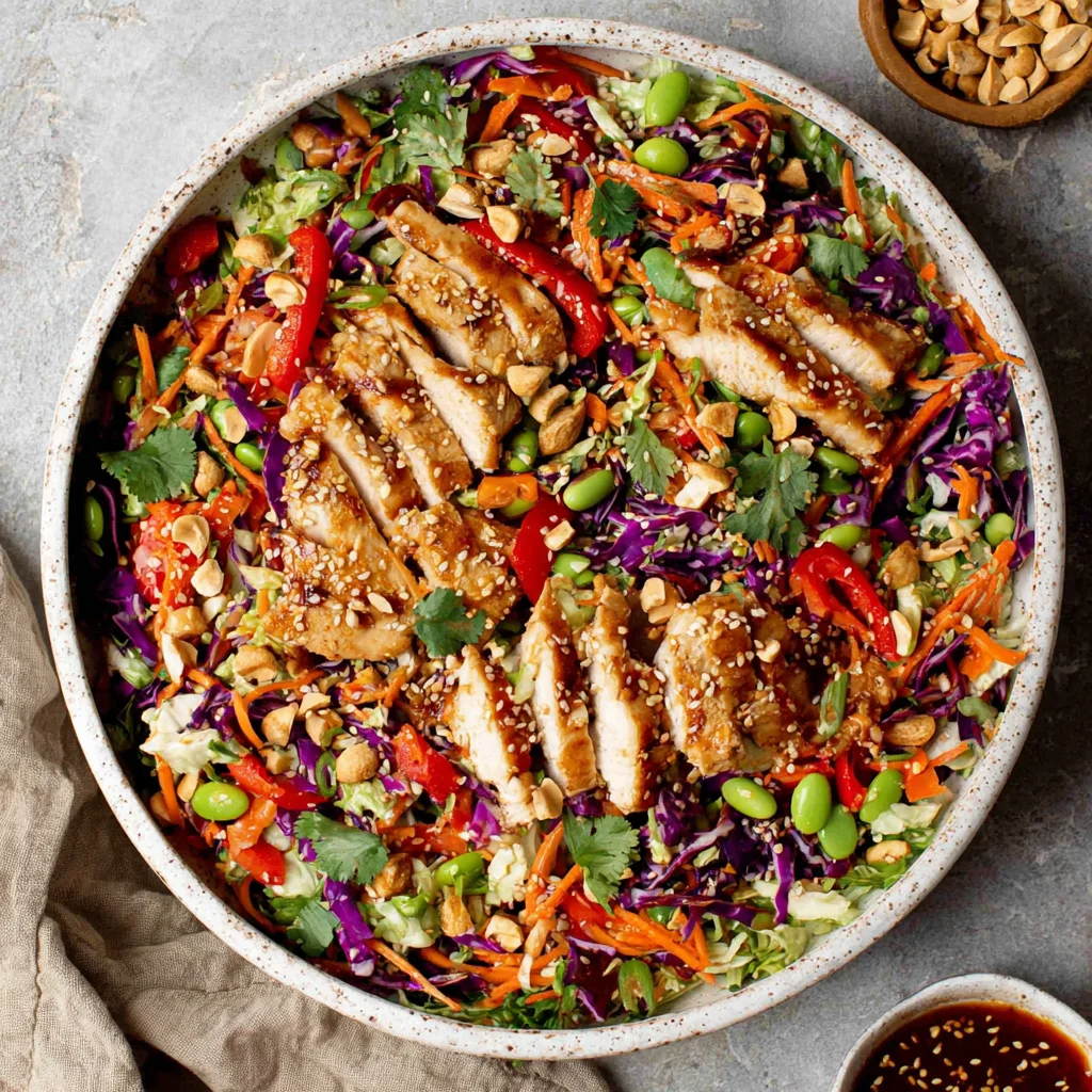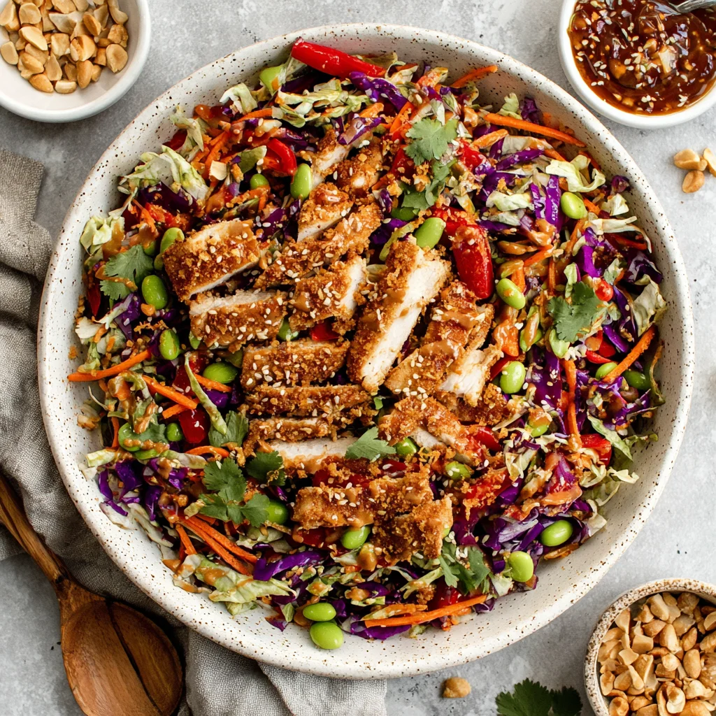 Discover a vibrant symphony of textures and flavors with this Asian Chicken Crunch Salad. Tender, marinated chicken meets a medley of crisp vegetables, all brought together by a rich, savory peanut dressing. This dish is a perfect blend of hearty and refreshing, making it an ideal meal for any day.
