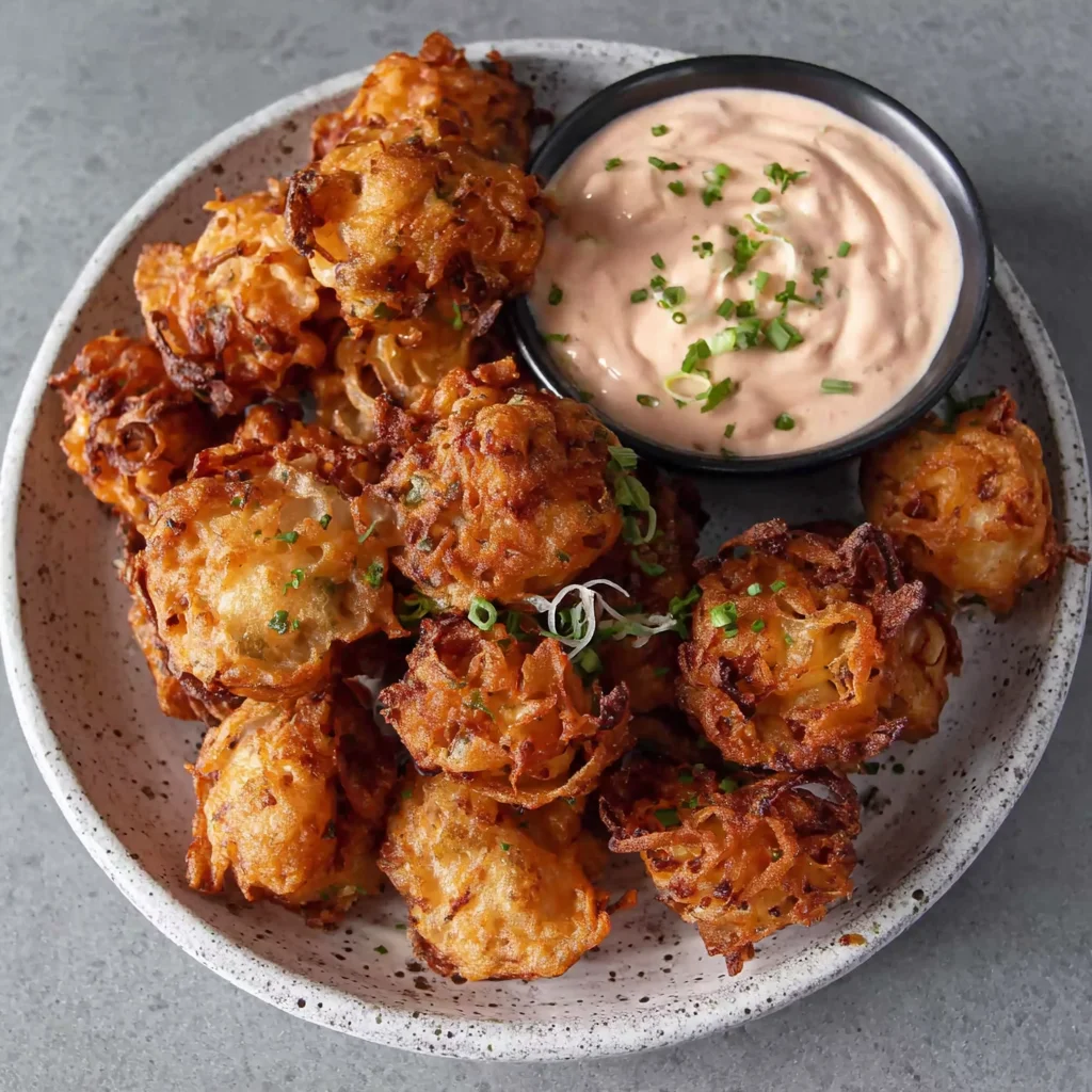 - Continue frying the remaining onion batter in batches until all the mixture is used. As you fry subsequent batches, the cooked onion bites can be kept warm in a preheated oven at a low temperature (around 90 degrees C or 200 degrees F) to ensure they are hot when served. Serve the hot, crispy Awesome Blossom Onion Bites immediately with the chilled, tangy dipping sauce.
