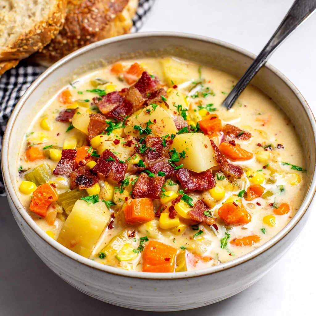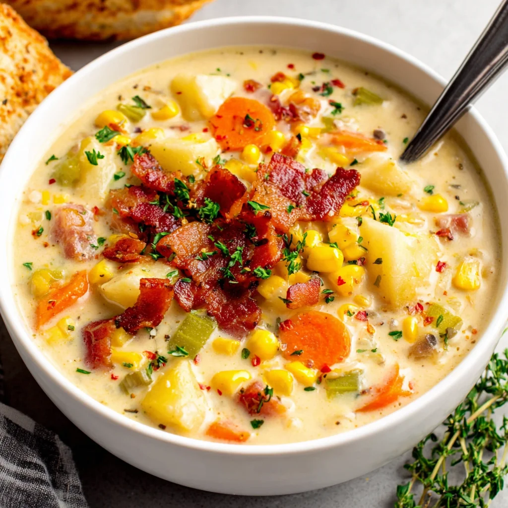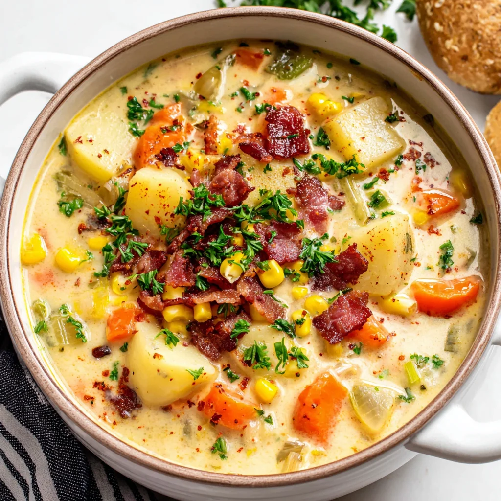 Indulge in the ultimate comfort food with this creamy, rich One-Pot Corn Chowder. Bursting with sweet corn, tender potatoes, and savory bacon, this hearty soup is incredibly easy to make, delivering maximum flavor with minimal cleanup. It's the perfect dish for a cozy evening, bringing warmth and satisfaction to every spoonful.
