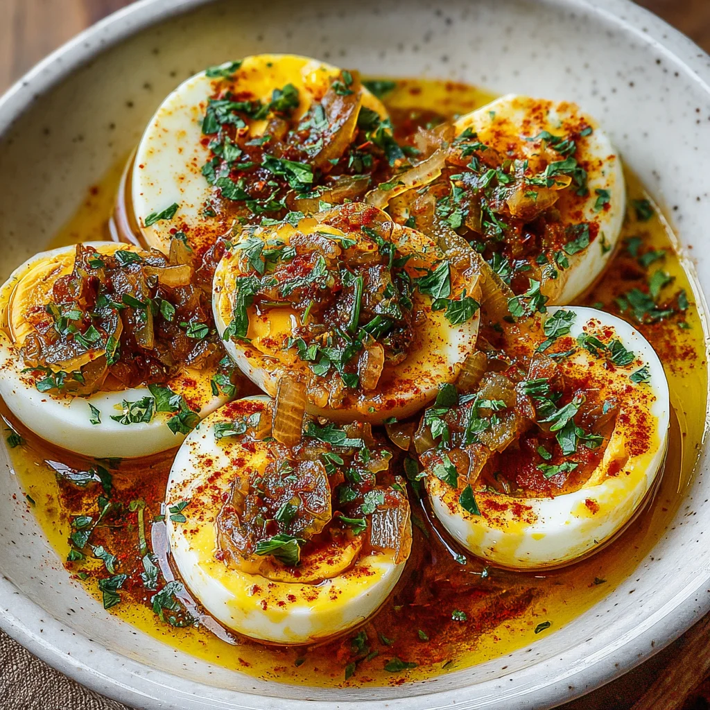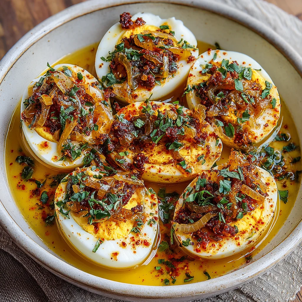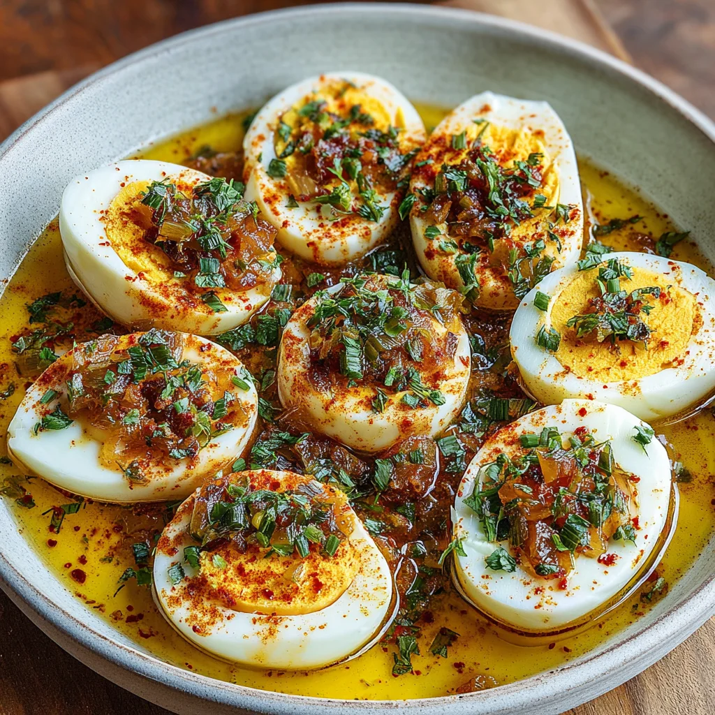 - Arrange the peeled hard-boiled eggs in a serving bowl. Carefully pour the hot, spicy garlic butter sauce evenly over the eggs, ensuring each egg is generously coated with the flavorful concoction.