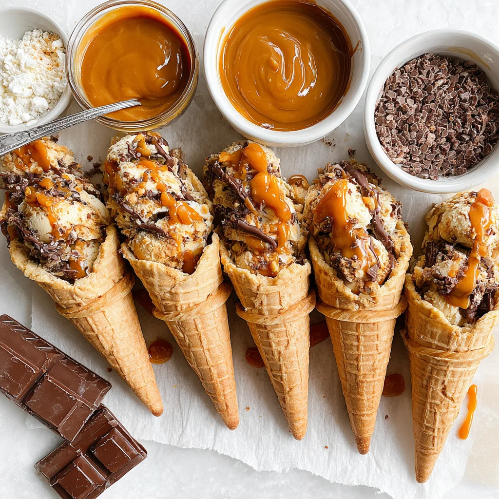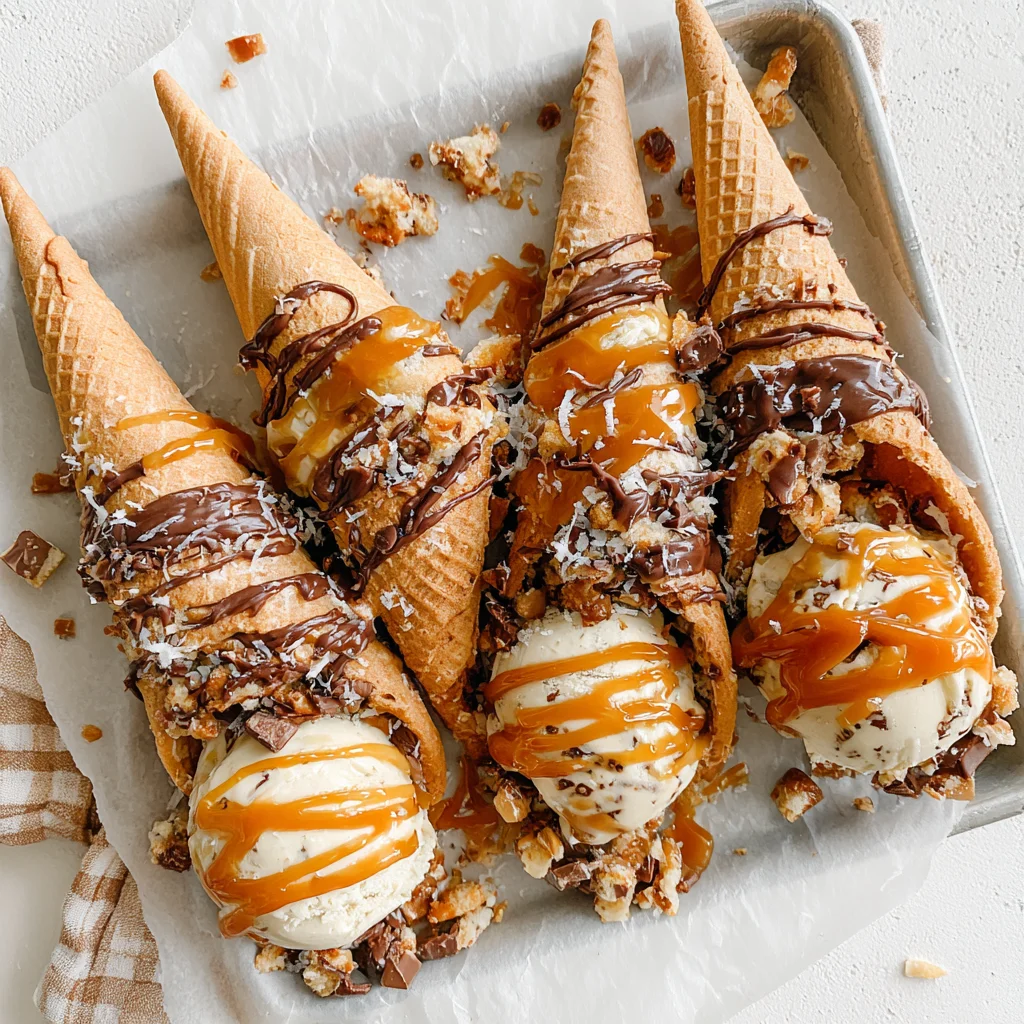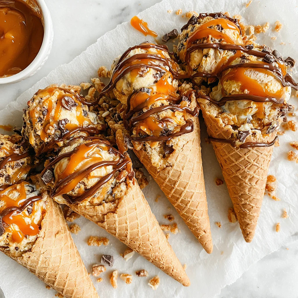 Indulge in a symphony of textures and flavors with these irresistible Caramel Cone Crunch Cookies. Each bite offers a delightful contrast: chewy, buttery cookie dough studded with pockets of melted caramel, crisp pieces of chocolate-coated waffle cone, and a hint of sea salt. These cookies are a playful yet sophisticated treat, perfect for impressing guests or simply elevating your everyday snack.