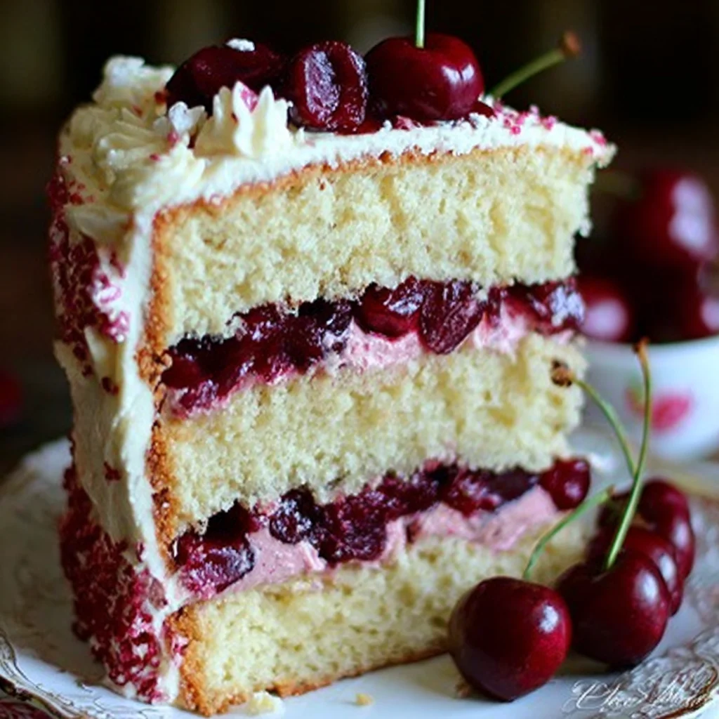 Indulge in a magnificent three-layer cherry cake, featuring a tender, moist crumb studded with sweet cherry pieces. Each layer is generously filled and topped with a luscious, tangy cherry cream cheese frosting, making for an unforgettable dessert experience. This cake is a perfect balance of fruitiness and rich creaminess, ideal for any celebration or a delightful weekend treat.