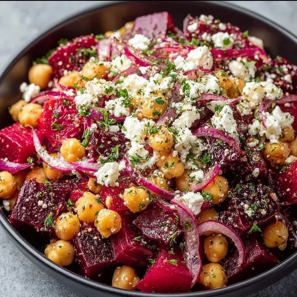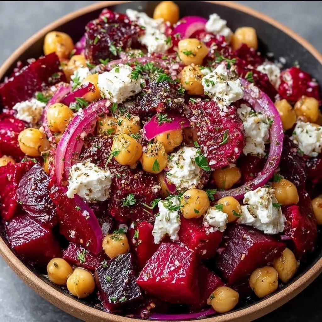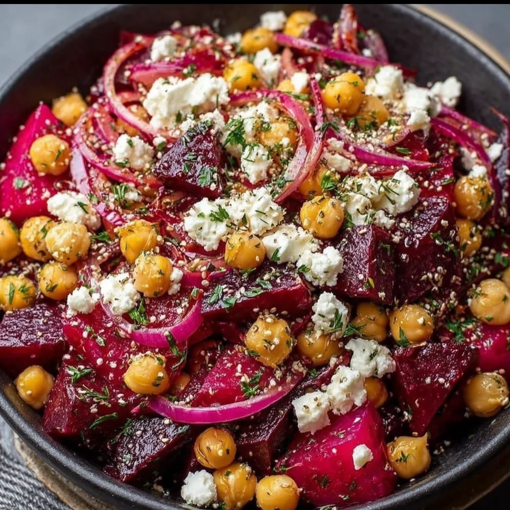 - A vibrant medley of earthy roasted beets, creamy feta, and protein-rich chickpeas.