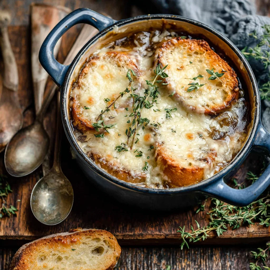 • Topped with toasted bread and perfectly melted Gruyère for that iconic finish.