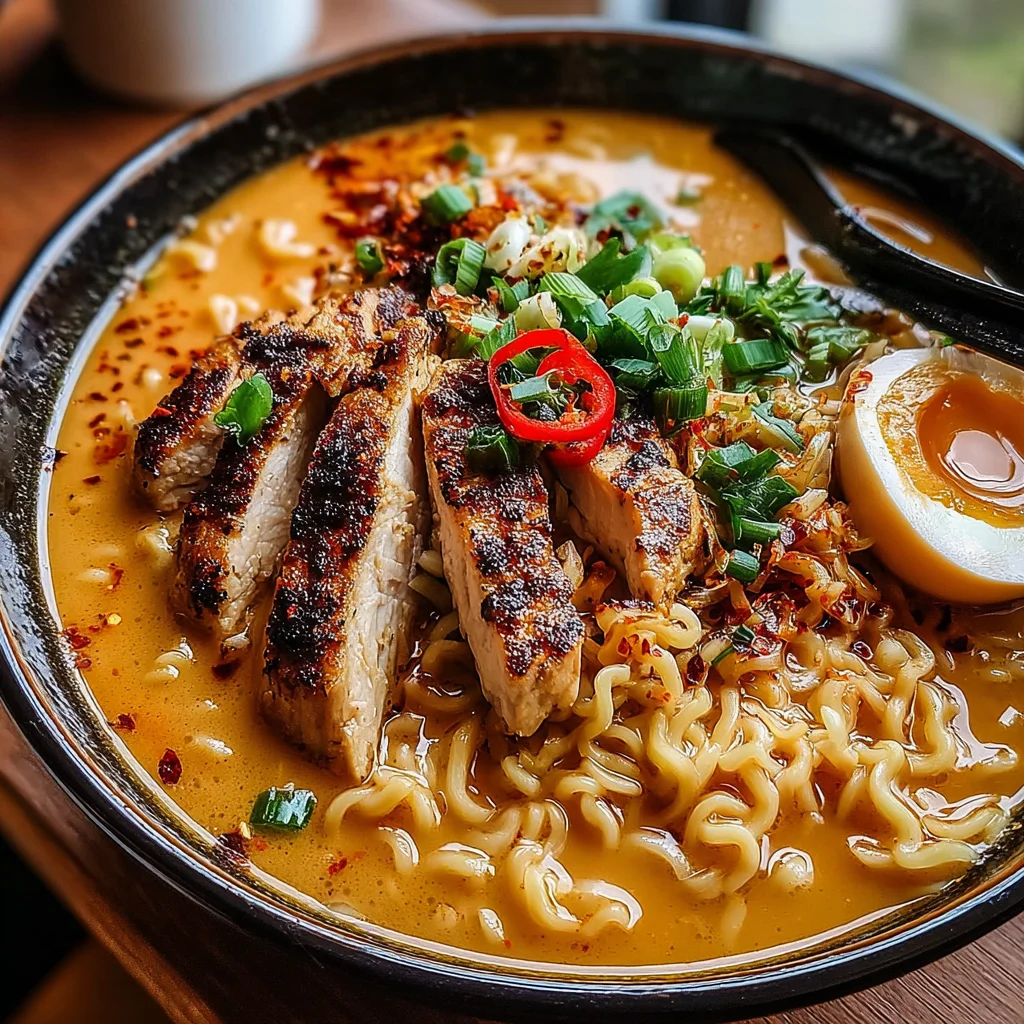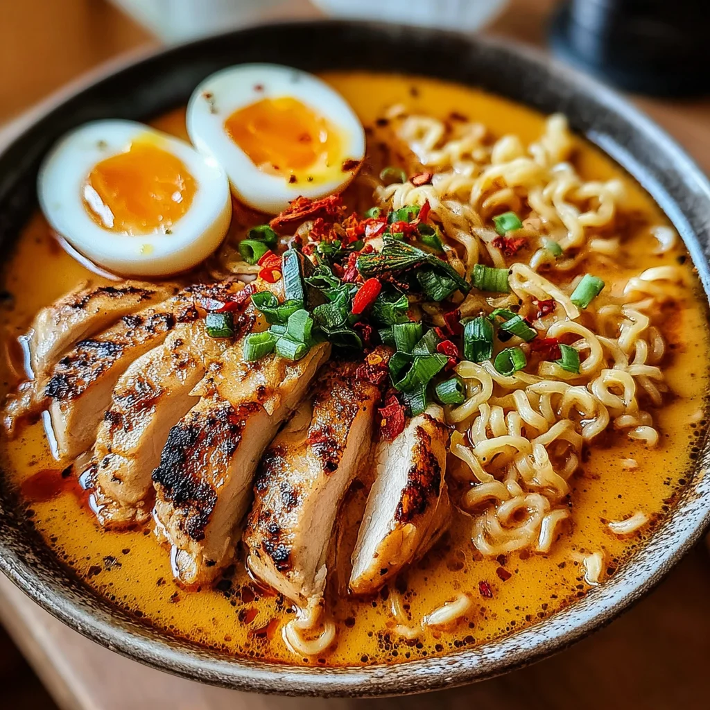 Indulge in the ultimate comfort food experience with this Creamy Garlic Chicken Ramen. Featuring tender, pan-seared chicken, springy ramen noodles, and a luxuriously rich, garlic-infused broth, this dish is a culinary hug in a bowl. It's surprisingly simple to prepare, making it perfect for a satisfying weeknight meal or a cozy weekend treat.