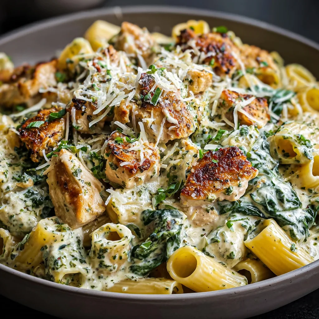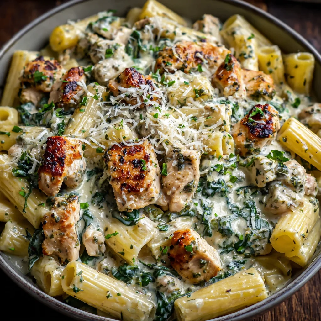 - Combines succulent chicken, al dente pasta, and a rich, herbaceous pesto cream sauce.