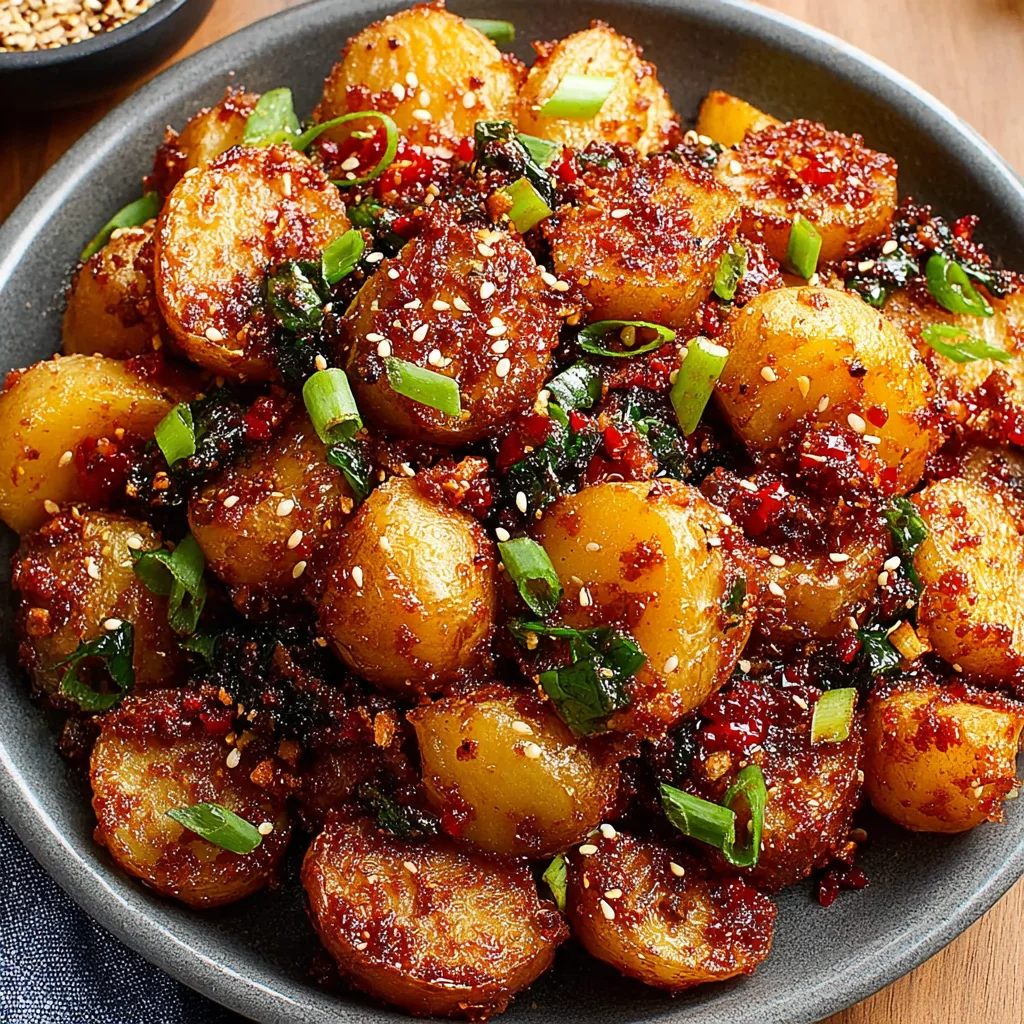 - Once the potatoes are roasted to a perfect crisp and have cooled slightly (they don't need to be completely cold, just not scorching hot straight from the oven), carefully transfer them to a large clean mixing bowl. Pour the prepared gochujang dressing generously over the potatoes. Gently toss the potatoes to coat every crispy piece evenly, ensuring the bold, spicy-sweet flavors meld together beautifully with the warm, tender potatoes.