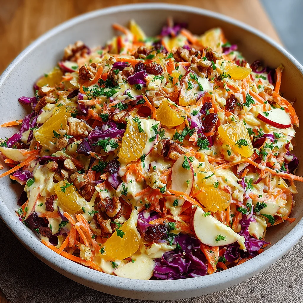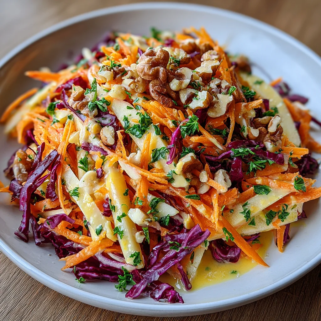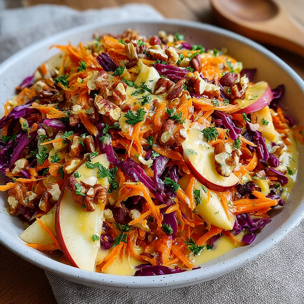 This vibrant salad is a delightful symphony of textures and flavors, combining the crisp sweetness of fresh apples and carrots with the subtle crunch of red cabbage and toasted nuts. Dressed in a bright, creamy citrus concoction, it offers a refreshing and satisfying experience that perfectly balances a main course or stands alone as a light, invigorating meal.