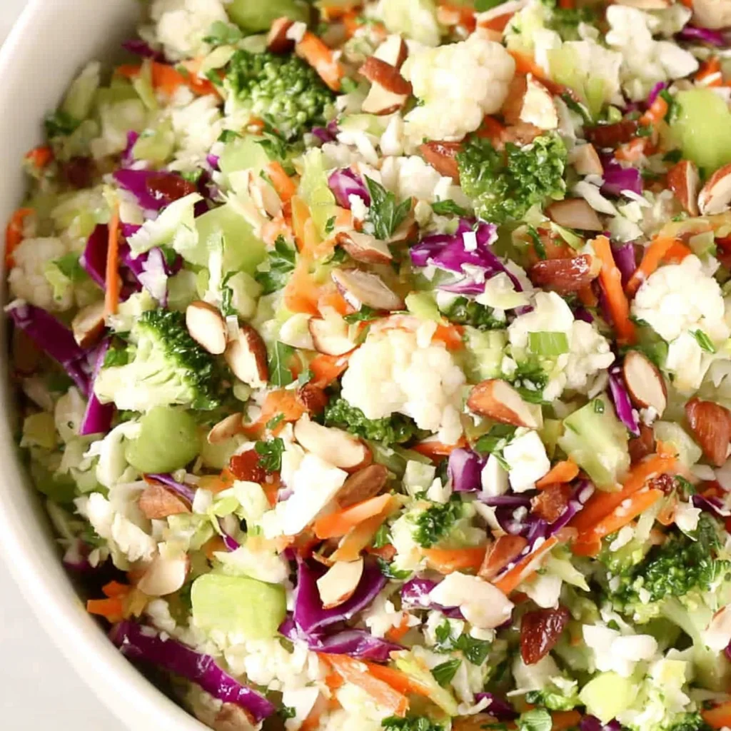 - In a large mixing bowl, combine all of the prepared salad ingredients: the chopped cauliflower, broccoli, red cabbage, carrots, parsley, celery, chopped raw almonds, raw sunflower seeds, and organic raisins. Set this aside while you prepare the dressing.