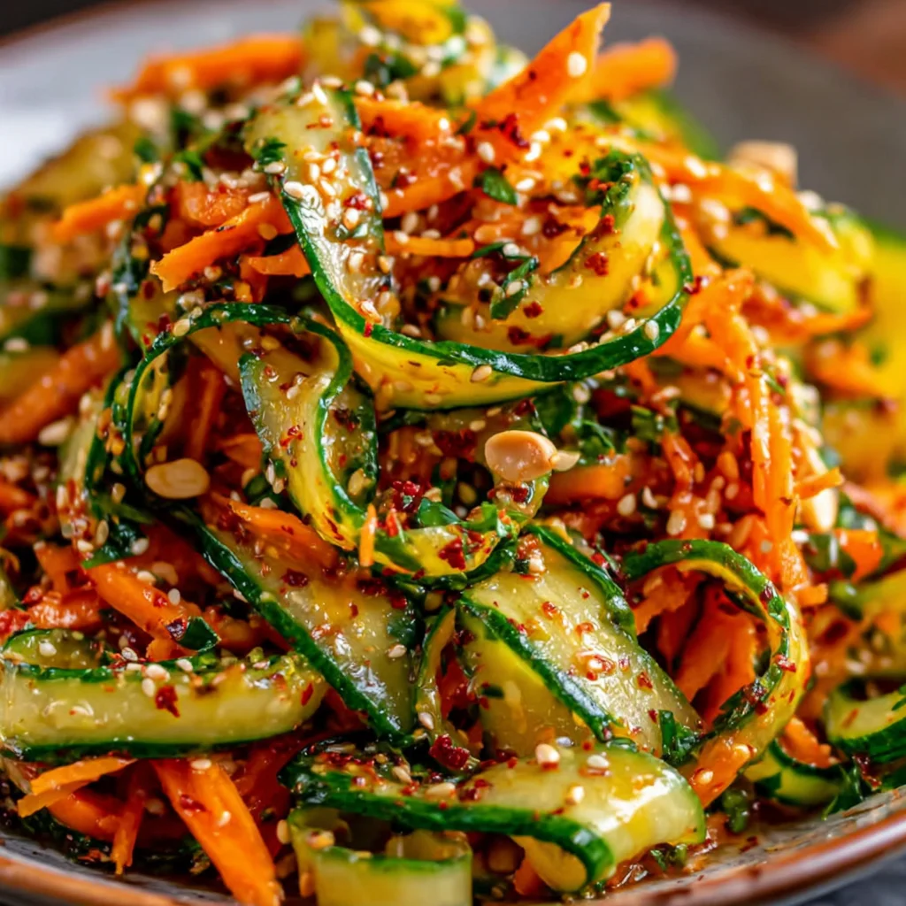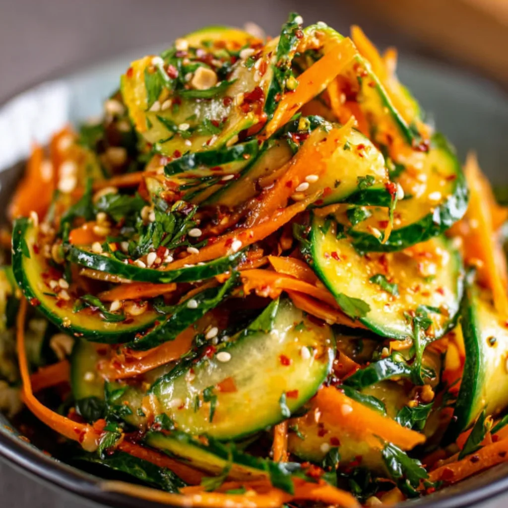 Discover a burst of refreshing flavors with this vibrant Cucumber Carrot Salad, featuring a unique gochugaru-infused dressing. This delightful dish combines crisp vegetables with a tangy, slightly spicy, and subtly sweet dressing, creating a perfectly balanced side that brightens any meal. It's an effortlessly elegant salad that’s both healthful and incredibly satisfying.