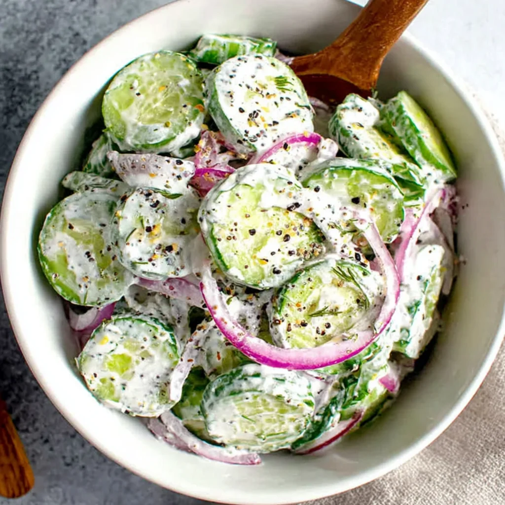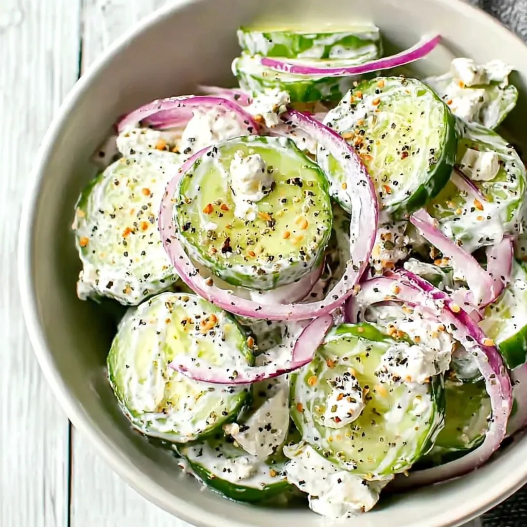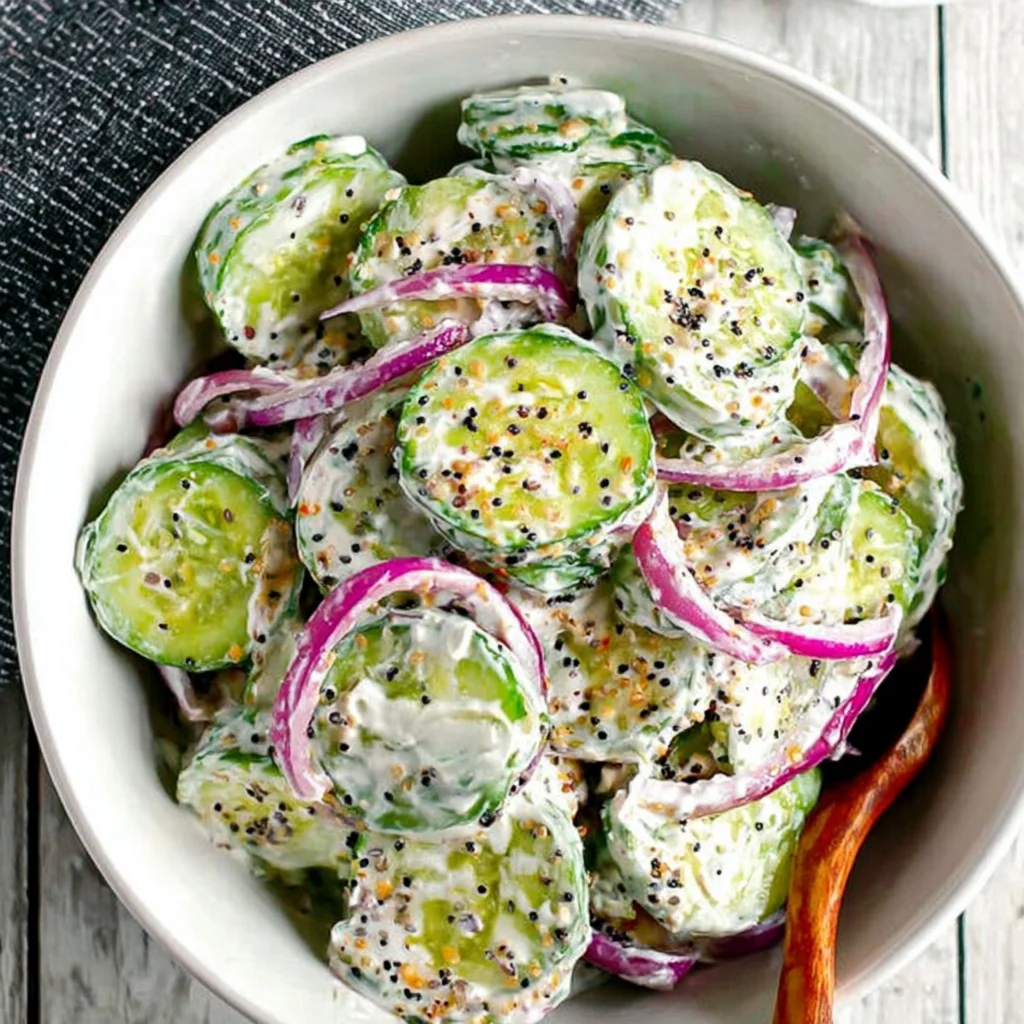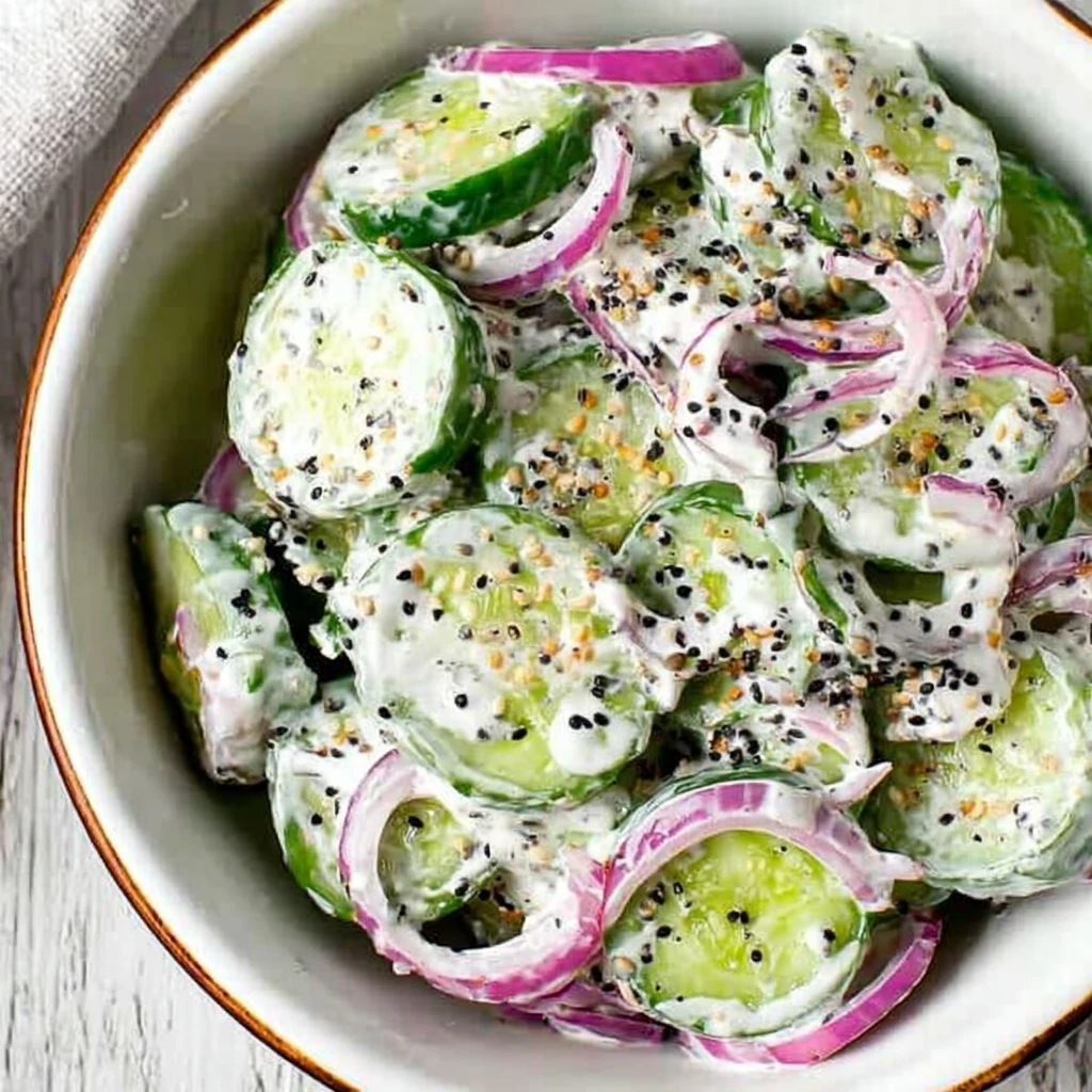 Indulge in the vibrant, refreshing crunch of this Everything Bagel Cucumber Salad, a delightful twist on a classic side. Thinly sliced cucumbers and red onion are tossed in a creamy, tangy sour cream dressing infused with the irresistible savory flavors of everything bagel seasoning. It's a remarkably easy-to-make dish that brings a burst of fresh flavor to any meal.