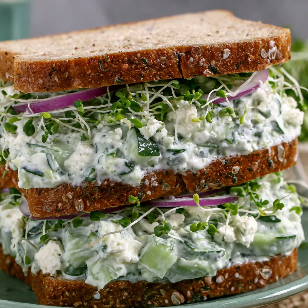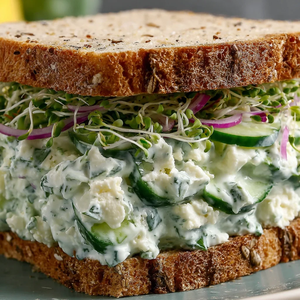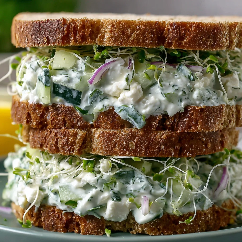 Discover the ultimate light and refreshing meal with these Effortless Cucumber and Feta Salad Sandwiches. Crisp, cool cucumber is tossed in a vibrant Greek yogurt dressing, brightened with lemon and fresh herbs, and studded with salty feta. Layered between wholesome bread with a hint of red onion and delicate sprouts, this dish is perfect for a quick lunch, a delightful picnic, or a sophisticated afternoon tea. It's a simple pleasure that truly celebrates fresh, clean flavors.
