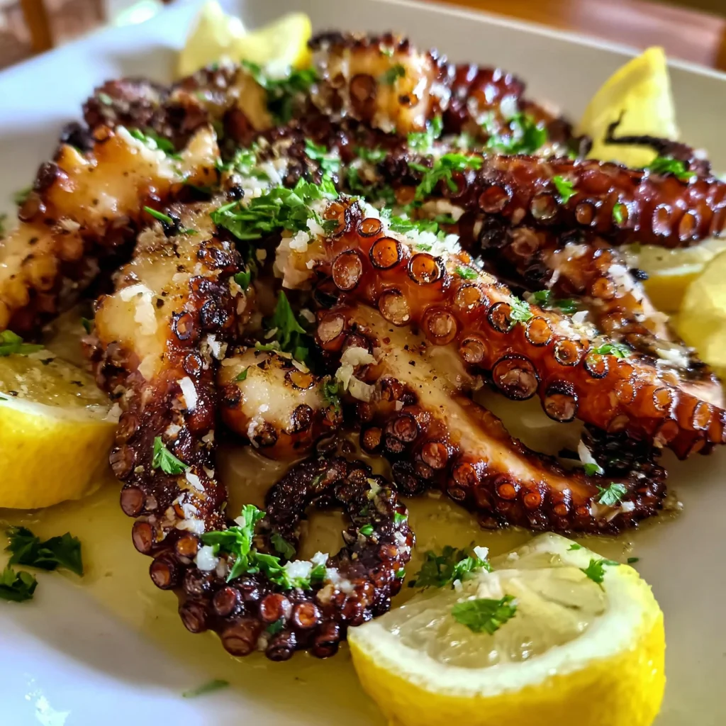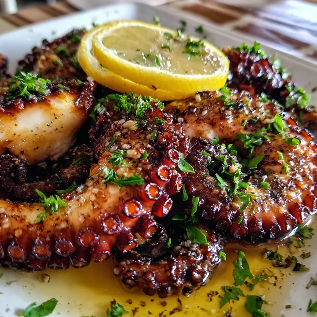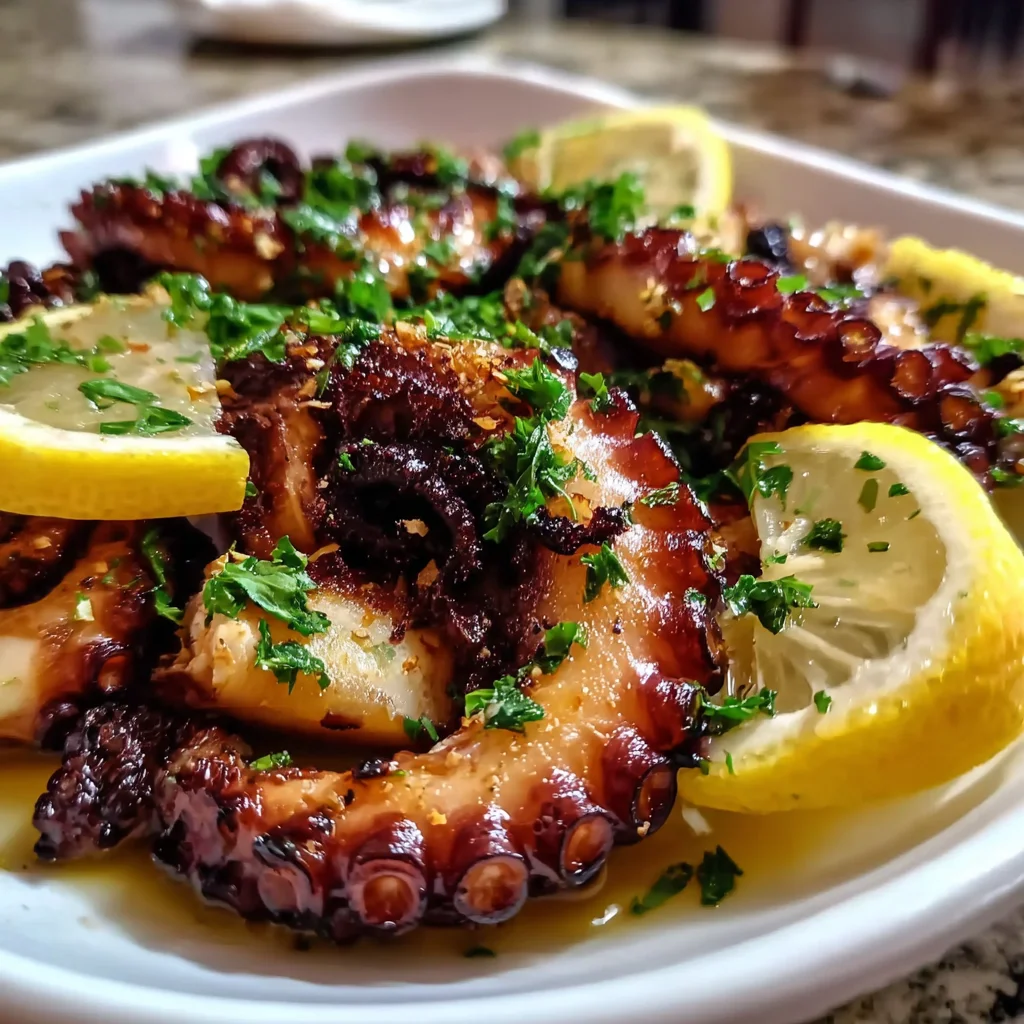 - Once perfectly grilled, transfer the octopus immediately to a serving platter. Generously scatter the chopped fresh parsley over the top for a burst of color and herbaceousness. Arrange the fresh lemon wedges alongside for guests to squeeze over their portions. Finish with a light sprinkle of sea salt to enhance all the flavors. Drizzle any remaining marinade from the shallow dish over the grilled octopus for extra shine and a zingy finish.