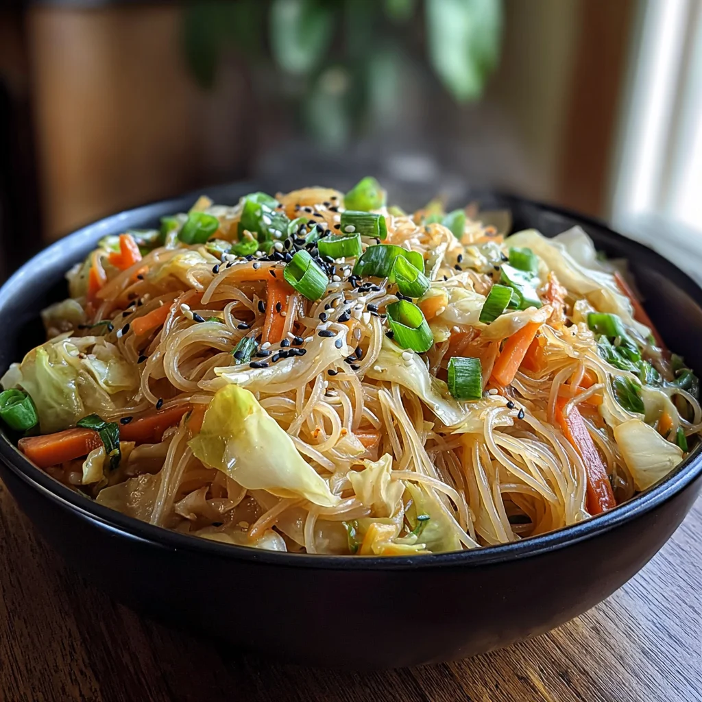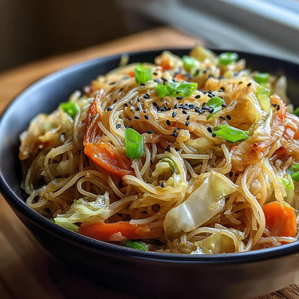 8. Remove the wok from the heat. Sprinkle the chopped green onions over the stir-fry, giving it a final gentle toss. Serve the easy vegetarian cabbage noodle stir-fry immediately while hot, optionally topped with toasted sesame seeds and chili flakes for an extra layer of flavor and heat.