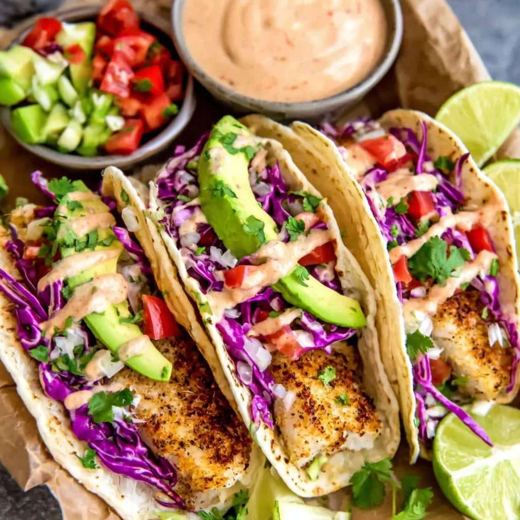 These irresistible fish tacos feature tender, flaky tilapia perfectly seasoned and baked, nestled in warm corn tortillas. They're piled high with fresh, vibrant toppings like crisp cabbage, creamy avocado, and zesty cilantro, all brought together by a creamy, tangy, and slightly spicy "best taco sauce." This dish is a celebration of fresh flavors and textures, perfect for a lively weeknight dinner or a casual gathering.