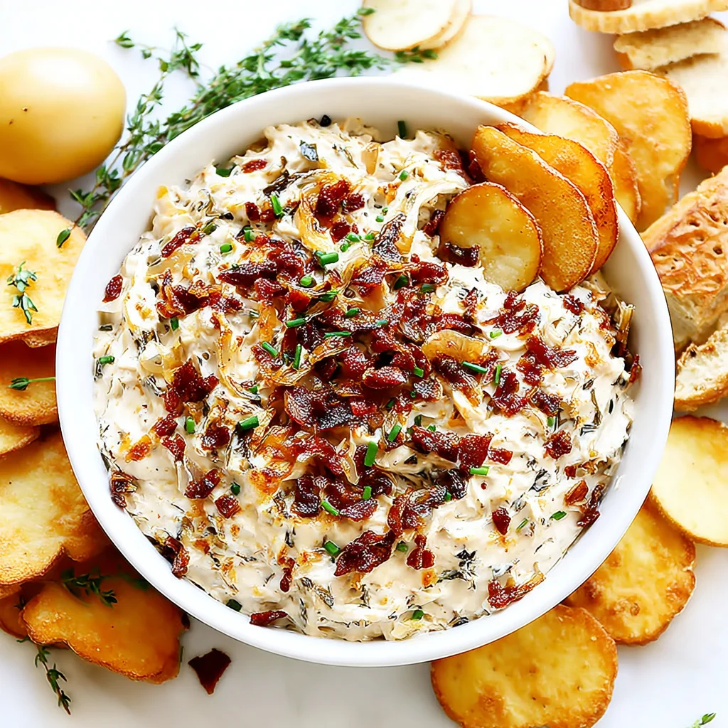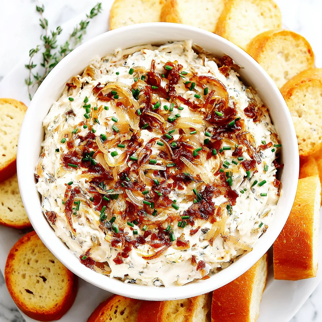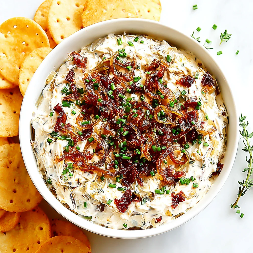 - Serve the dip immediately, garnished with the reserved caramelized onions and an extra sprinkle of fresh chives for color and freshness. Alternatively, cover the bowl and refrigerate the dip for at least 1 hour to allow the flavors to meld and deepen, which often results in an even more delicious dip. The dip can be refrigerated for up to 3 days.