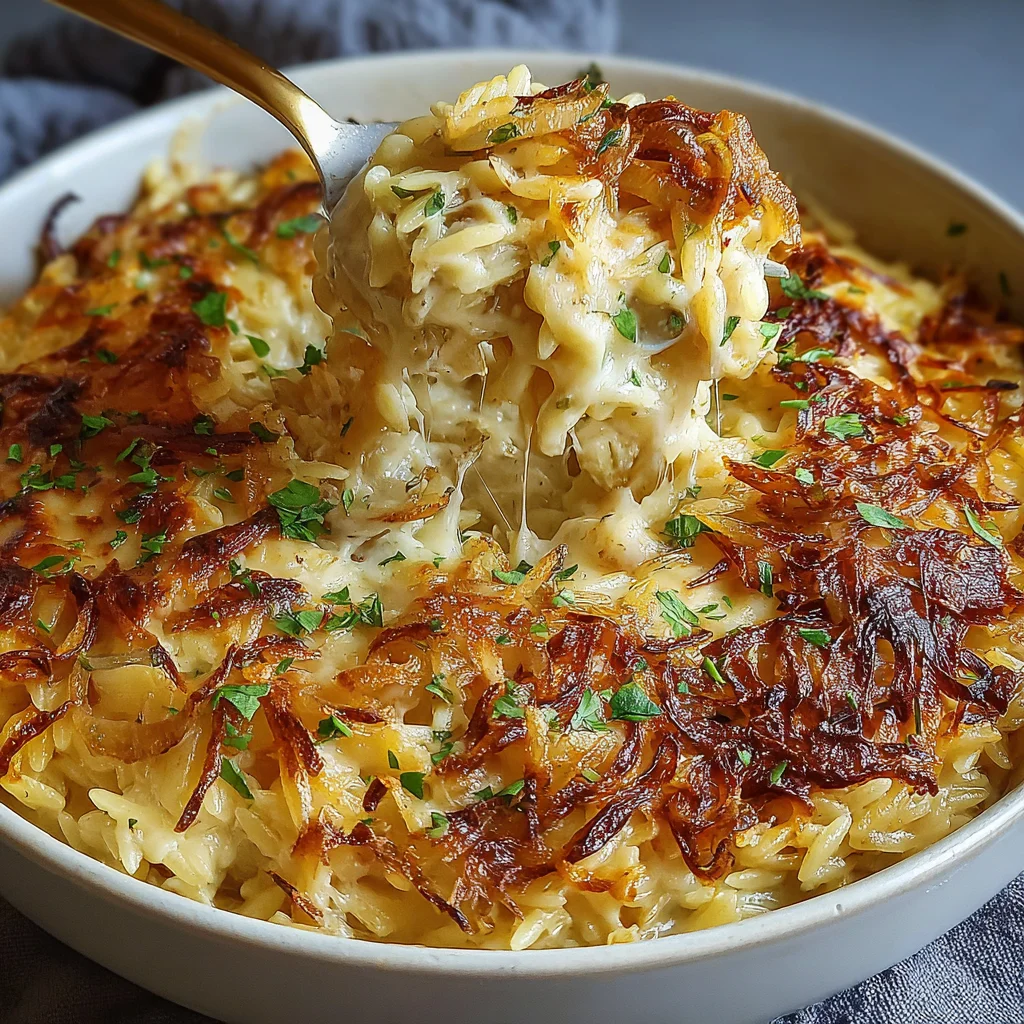 Experience the soulful comfort of classic French onion soup transformed into a hearty, satisfying baked pasta dish. This French Onion Orzo Bake features tender orzo pasta enveloped in a rich, creamy sauce with deeply caramelized onions, fragrant thyme, and a blend of savory Gruyère and Parmesan cheeses. It's an elegant yet approachable meal that promises warmth and flavor in every golden, bubbly bite.