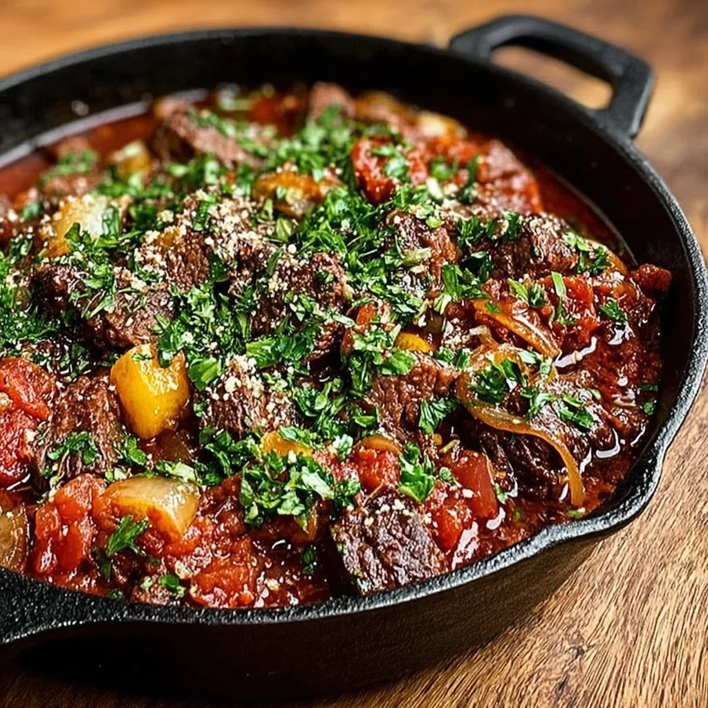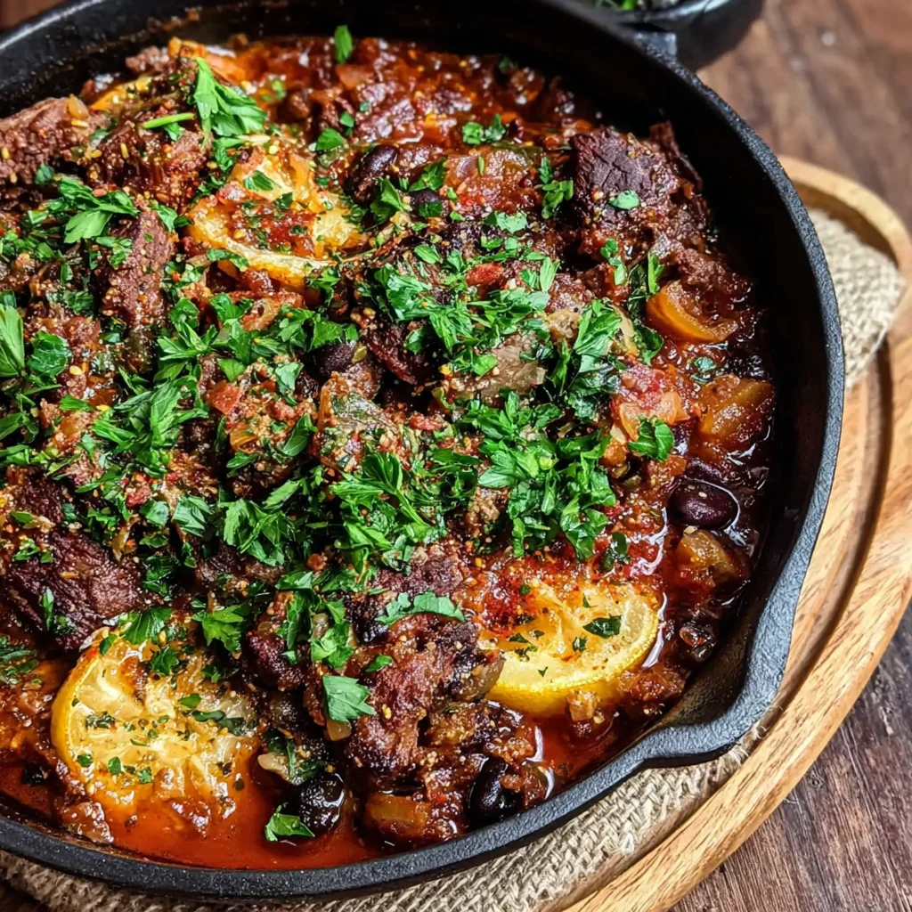 8. Serve: Once the beef is fork-tender and the sauce has slightly thickened to your liking, remove the skillet from the heat. Ladle the Greek Beef generously onto plates. Garnish with a sprinkle of freshly chopped parsley for freshness and a vibrant pop of color. Serve immediately with fresh lemon wedges on the side for an optional burst of zest, allowing diners to customize their experience.