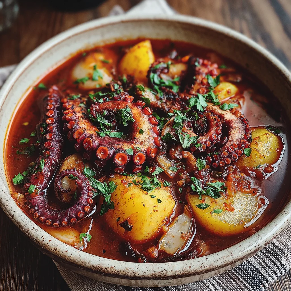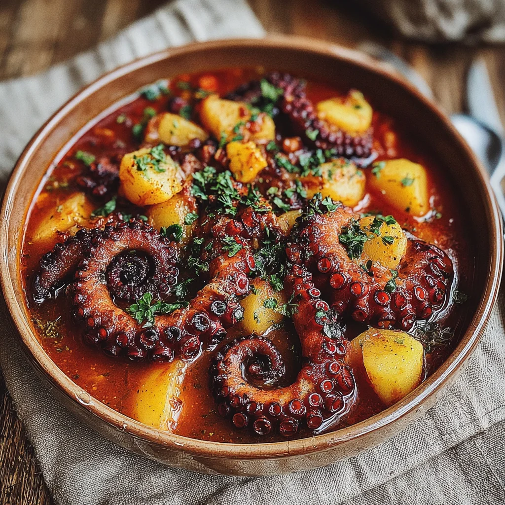 Embark on a culinary journey to the Mediterranean with this authentic Greek Octopus Stifado. This hearty and aromatic stew features tender octopus simmered slowly in a rich, deeply flavored tomato sauce, infused with the warming spices of cinnamon, cloves, and allspice. A true taste of Greek comfort, it's a dish that perfectly balances savory seafood with sweet, tangy notes and a hint of spice, making it an unforgettable dining experience.