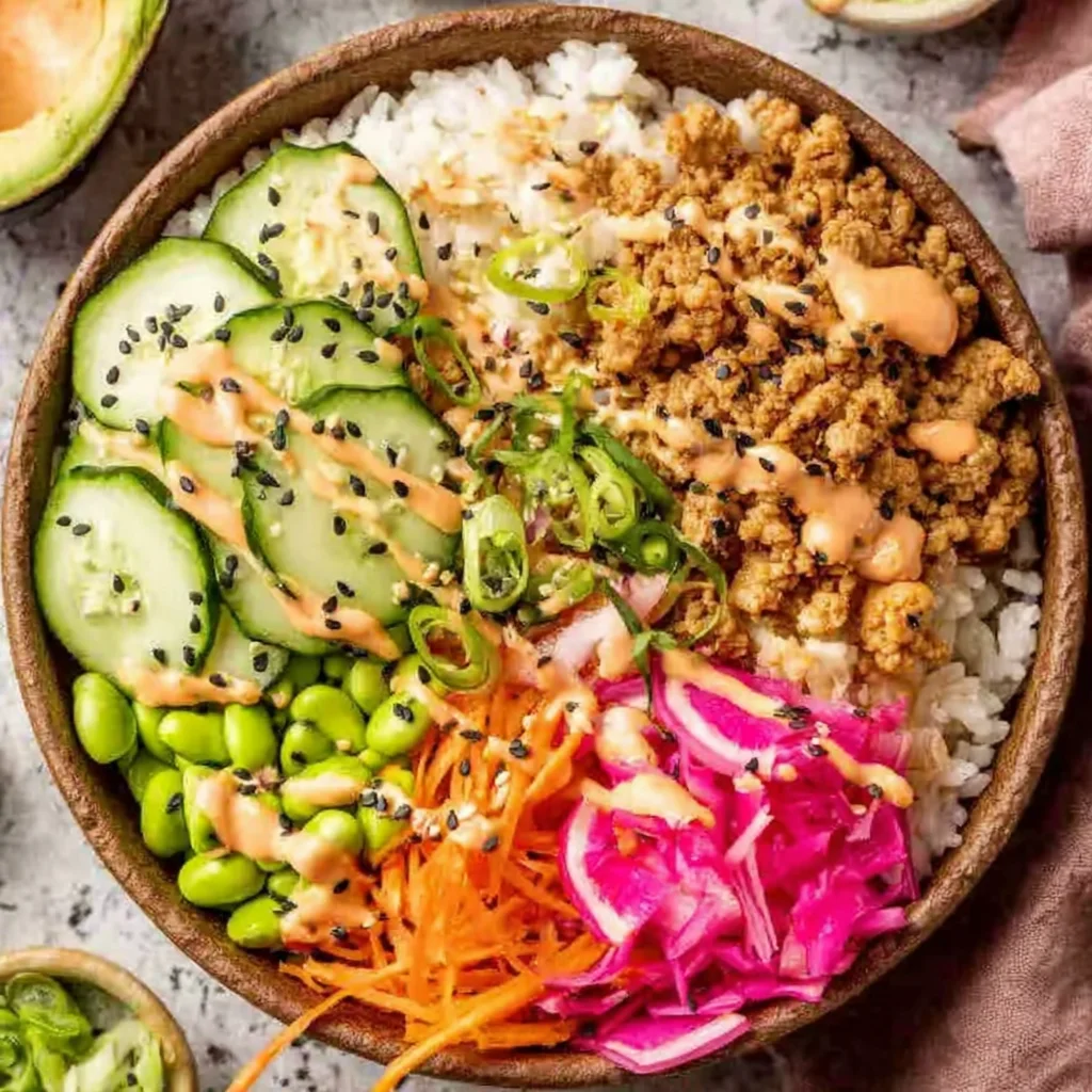 - Assemble your delicious rice bowls. There are no strict rules here; personalize each bowl to your liking. Start with a generous bed of cooked rice in each bowl. Then, arrange an assortment of your favorite fresh vegetables around the rice, such as shredded carrots, sliced cucumbers, shelled edamame, pickled red onions, sliced avocado, and shredded cabbage. Spoon a generous portion of the warm ground turkey mixture over or alongside the rice.
