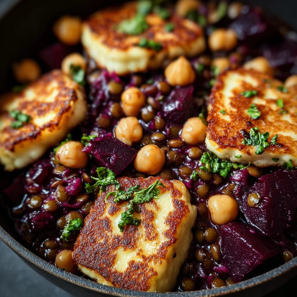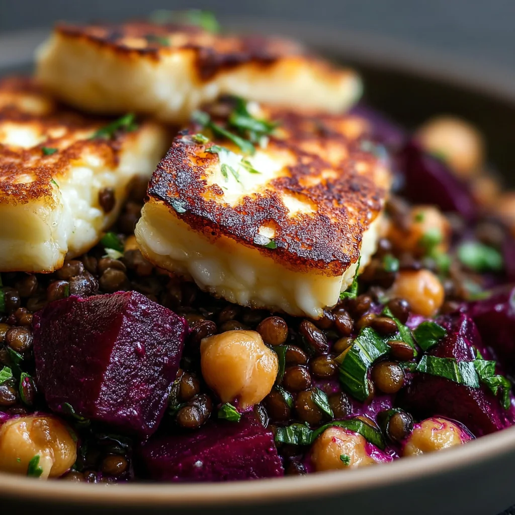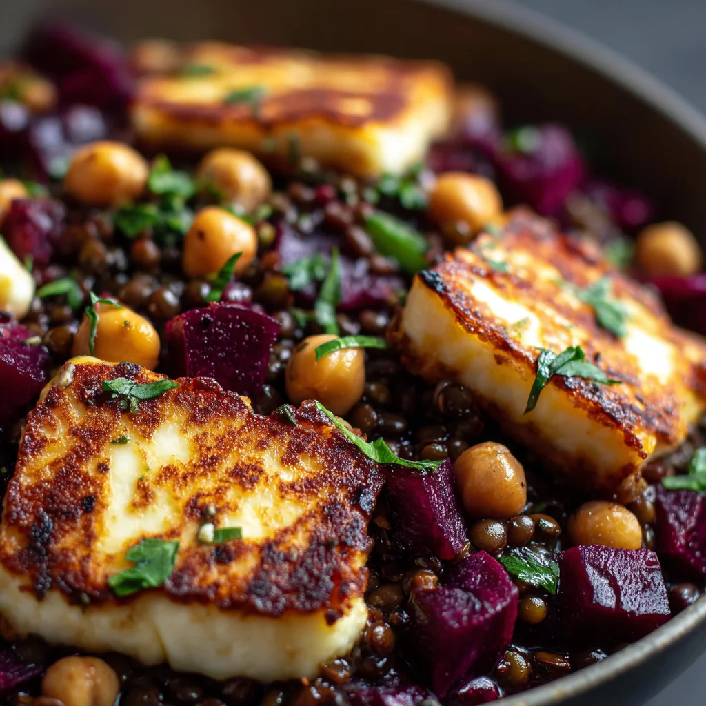 - Features a delightful contrast of textures: creamy lentils, firm chickpeas, tender beets, and squeaky, pan-fried halloumi.