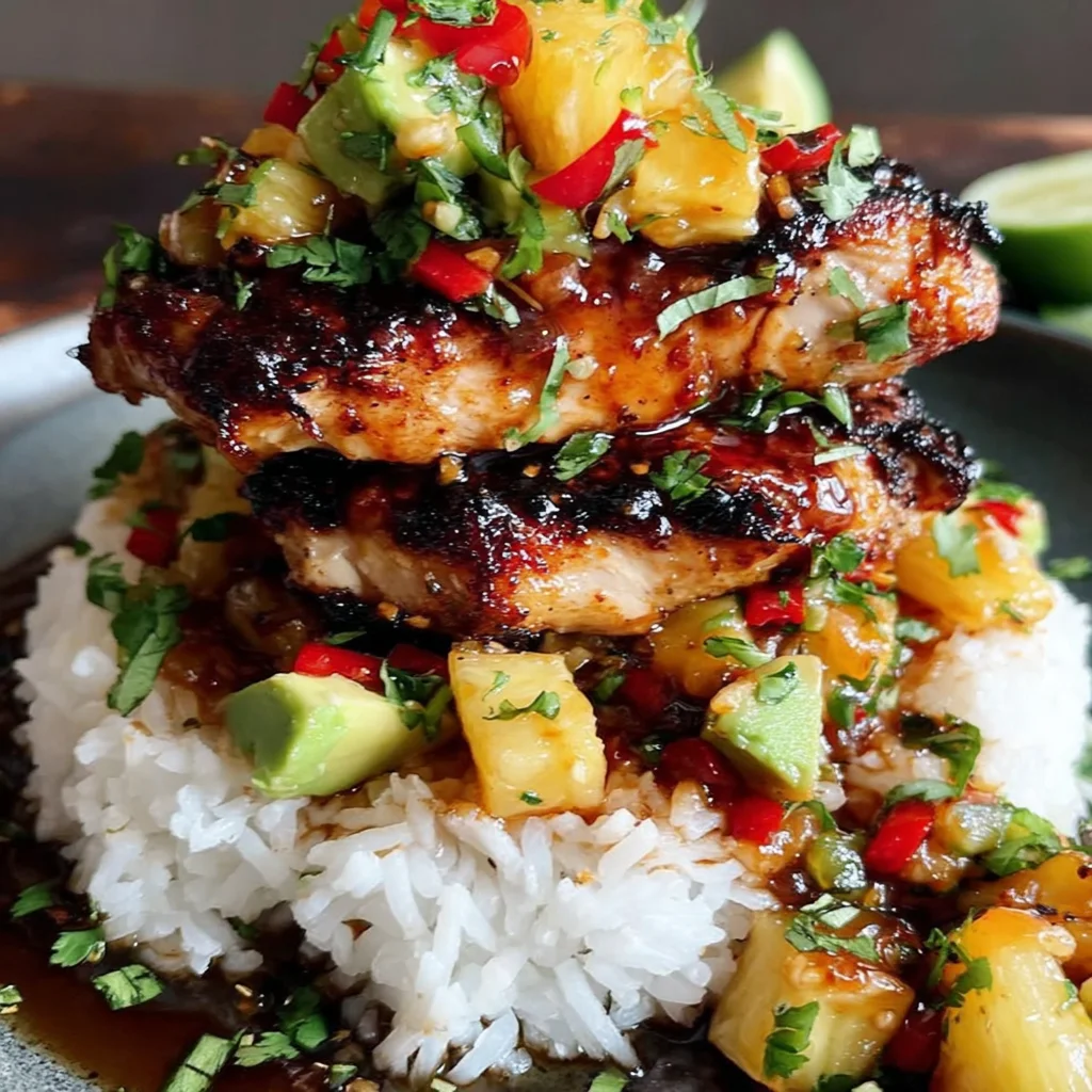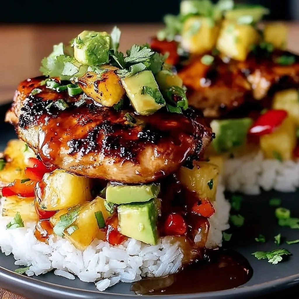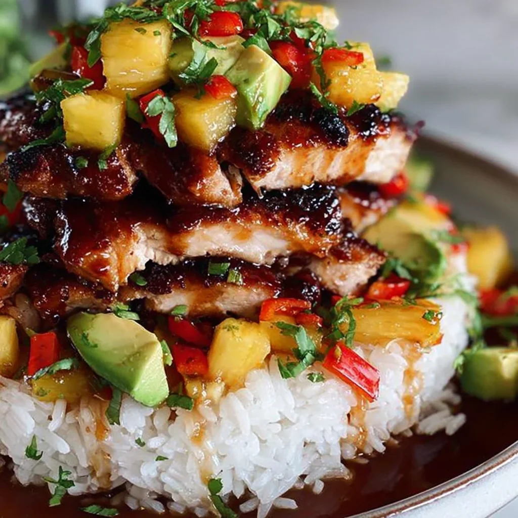 This vibrant Hawaiian Huli Huli Chicken Stack brings the tropical flavors of the islands right to your plate. Succulent boneless, skinless chicken thighs are marinated in a sweet and savory Huli Huli sauce, then perfectly grilled and served atop fluffy jasmine rice. Layered with fresh pineapple, crunchy bell peppers, creamy avocado, and aromatic herbs, it's a balanced, incredibly flavorful, and visually appealing meal that transports you straight to paradise.