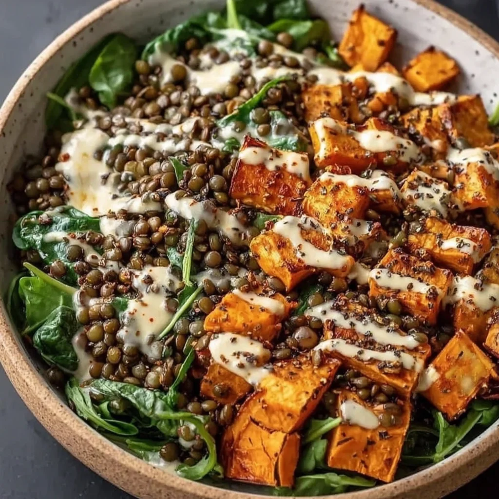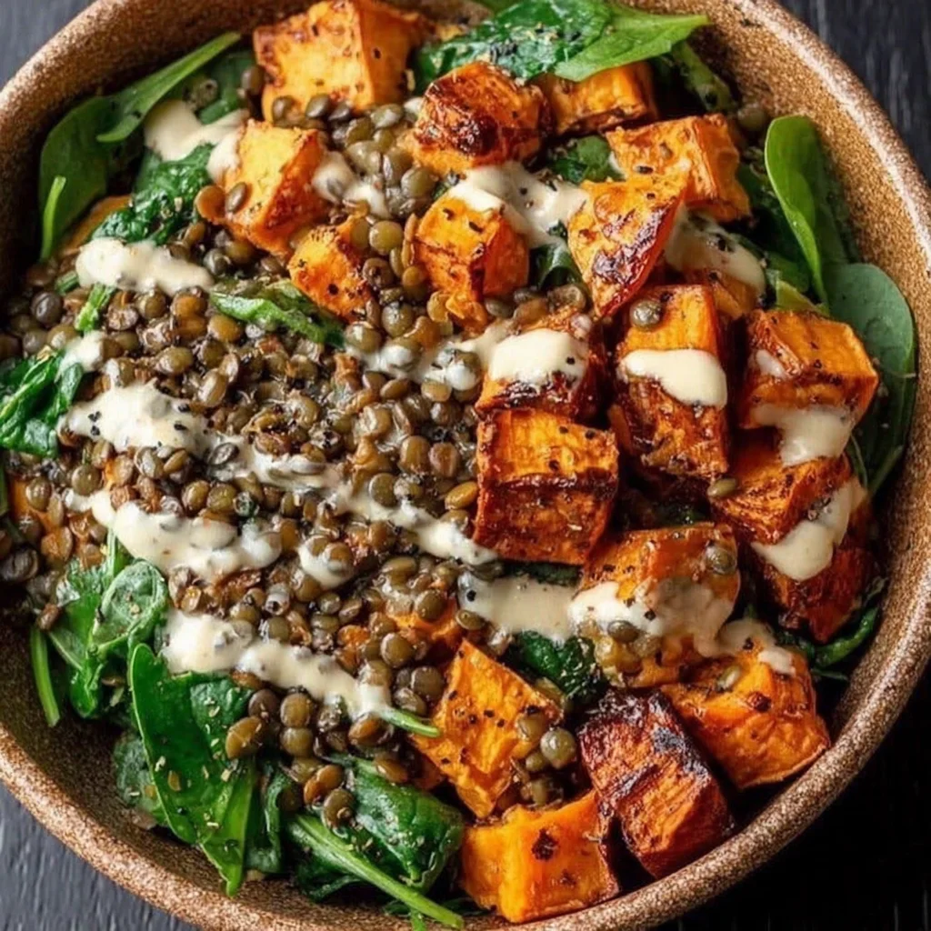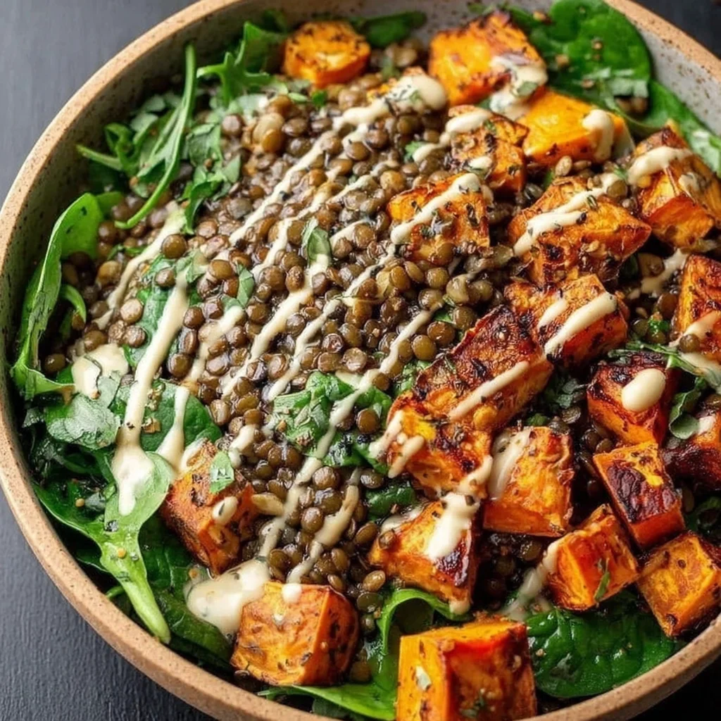 Discover a vibrant and nutritious meal that's perfect for a healthy lunch or light dinner. This delightful bowl features tender, smoky roasted sweet potatoes paired with earthy, protein-rich lentils, all layered over a bed of fresh greens. It's a comforting yet light dish, offering a wonderful balance of flavors and textures.