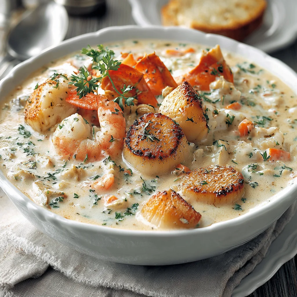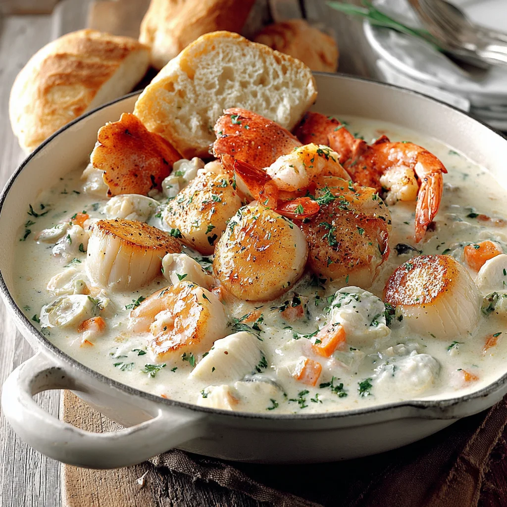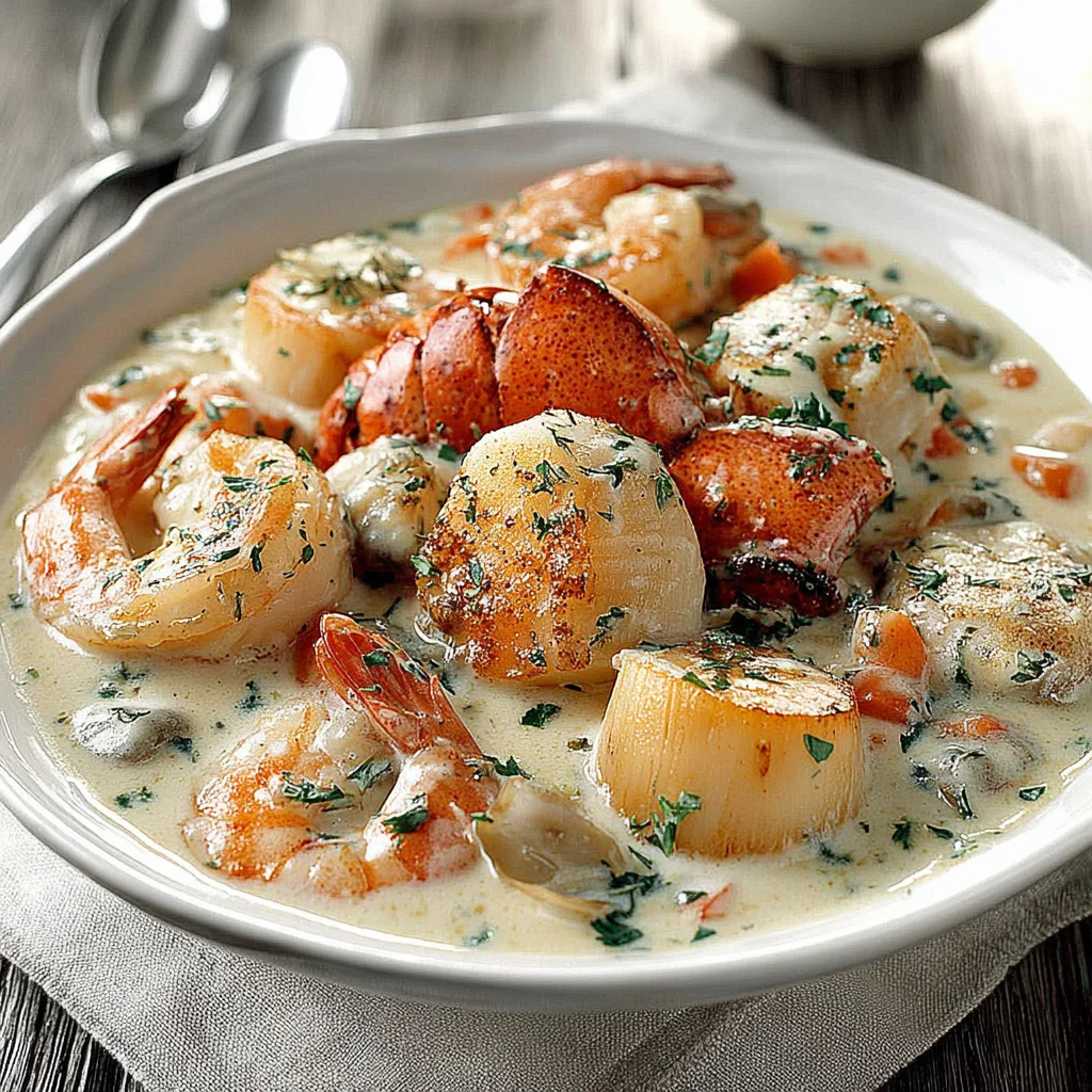 Contains shellfish (lobster, shrimp, scallops), dairy (butter, heavy cream), and gluten (flour). For a gluten-free version, use a gluten-free all-purpose flour blend or cornstarch for thickening. For a dairy-free option, use plant-based butter and cream alternatives, though the richness will differ.