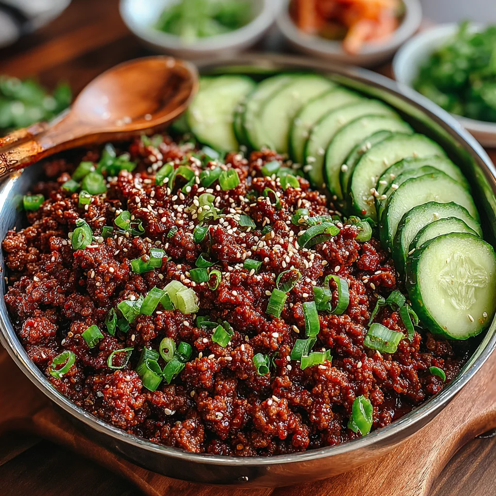 6. To serve, spoon generous portions of the hot, spicy Korean ground beef onto plates. Serve the crisp cucumber salad alongside. For an extra layer of flavor and aroma, drizzle a small amount of additional sesame oil over both the beef and the salad just before serving.