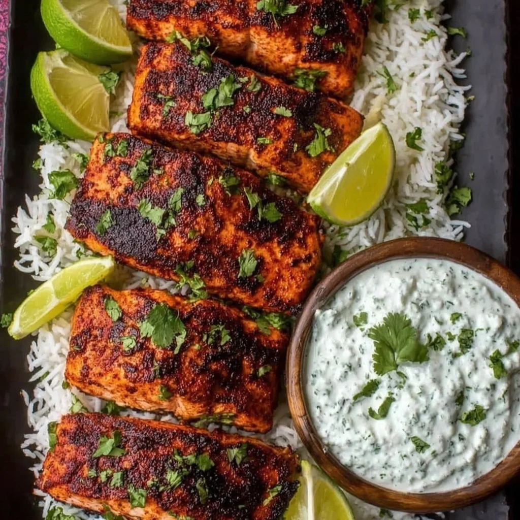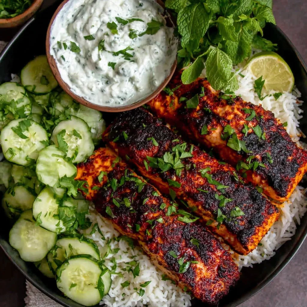 - The cooling Raita provides a refreshing contrast, perfectly balancing the spicy salmon.