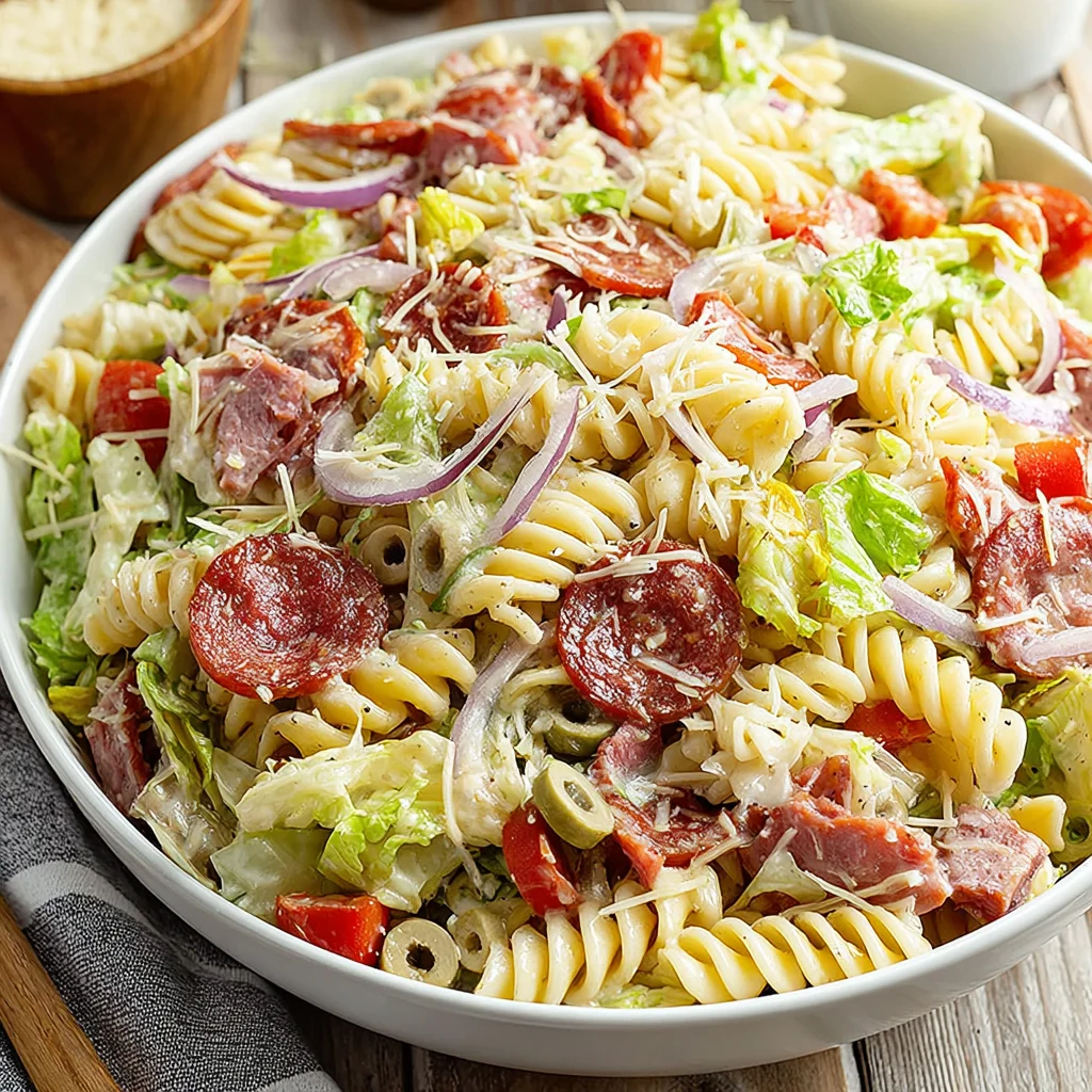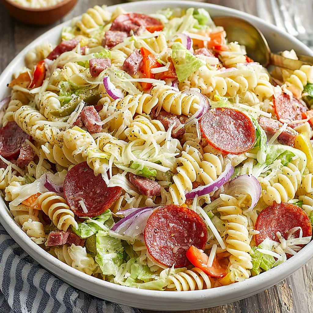 This Italian Grinder Pasta Salad transforms the beloved deli sandwich into a refreshing and robust pasta dish, perfect for picnics, potlucks, or a hearty lunch. Packed with savory cured meats, crisp vegetables, sharp cheeses, and a tangy, creamy dressing, it offers a harmonious blend of textures and flavors in every bite. It's a satisfying twist on classic pasta salad, bringing a vibrant taste of Italy straight to your table.