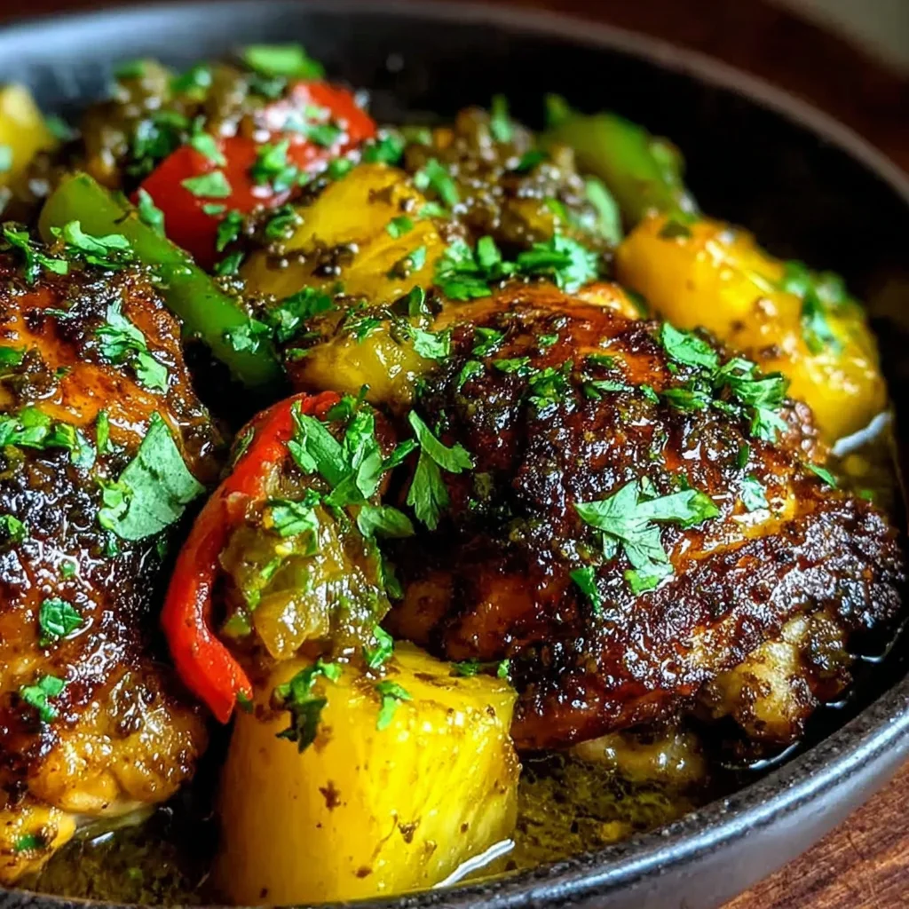 Transport your taste buds to the Caribbean with this vibrant Jamaican Pineapple Jerk Chicken Bake. Juicy bone-in, skin-on chicken thighs are marinated in a fiery jerk seasoning, then baked to perfection alongside sweet pineapple and colorful bell peppers. This one-pan wonder delivers a harmonious blend of spicy, sweet, and savory flavors, making for an unforgettable meal.