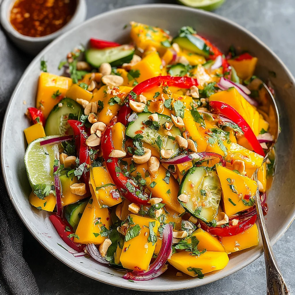 Experience a burst of fresh, vibrant flavors with this exquisite Thai Mango Salad. Sweet, ripe mangoes are perfectly balanced with crisp vegetables and a zesty, savory dressing, creating a truly refreshing and unforgettable dish. It's an ideal light meal or a stunning side for any occasion, promising a delightful journey for your taste buds.