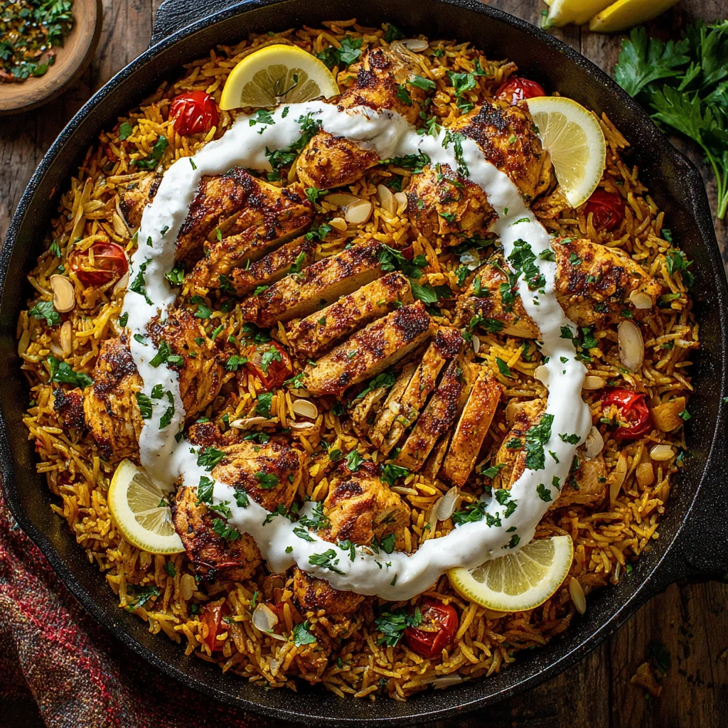 - Garnish and serve. Ladle generous portions of the Chicken Shawarma Rice onto plates. Garnish with a sprinkle of fresh chopped parsley, a scattering of toasted sliced almonds or pine nuts, and a drizzle of cool yogurt sauce or creamy tahini. Serve immediately with fresh lemon wedges on the side for an extra burst of zest.