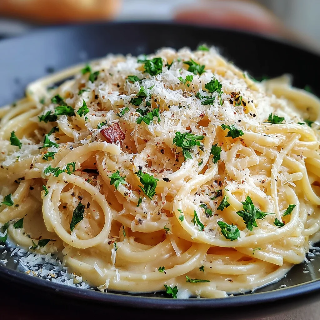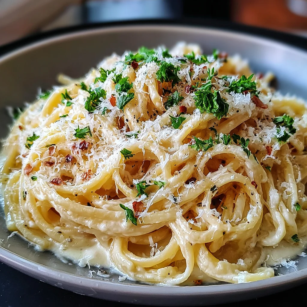 - Check the consistency of the sauce; if it appears too thick, add a small splash of hot water (about 15-30 ml or 1-2 tablespoons) at a time, stirring until the desired creaminess is achieved. Taste and adjust seasonings with additional salt or pepper if needed. Serve the creamy garlic pasta hot, garnished generously with fresh chopped parsley or basil and extra Parmesan cheese.