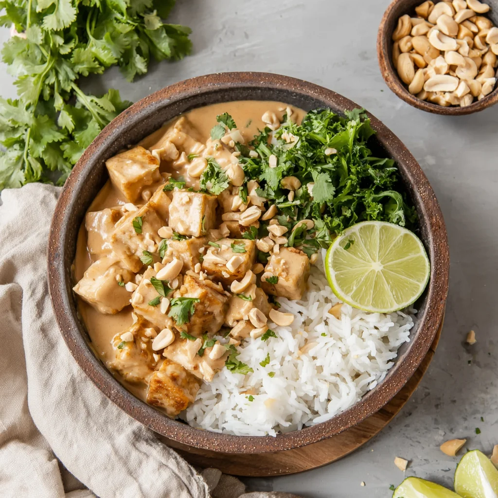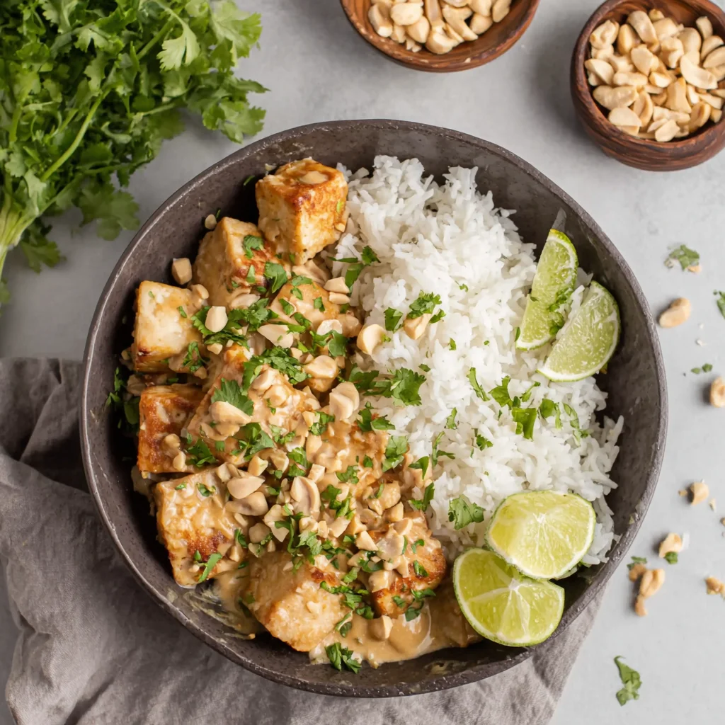 While the peanut sauce and coconut rice can be prepared a day in advance, it is best to cook the tofu fresh and combine it with the sauce just before serving to maintain its crispy texture.