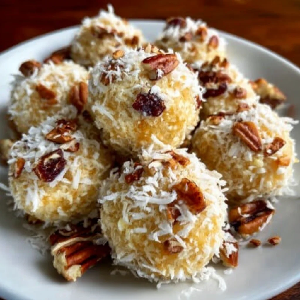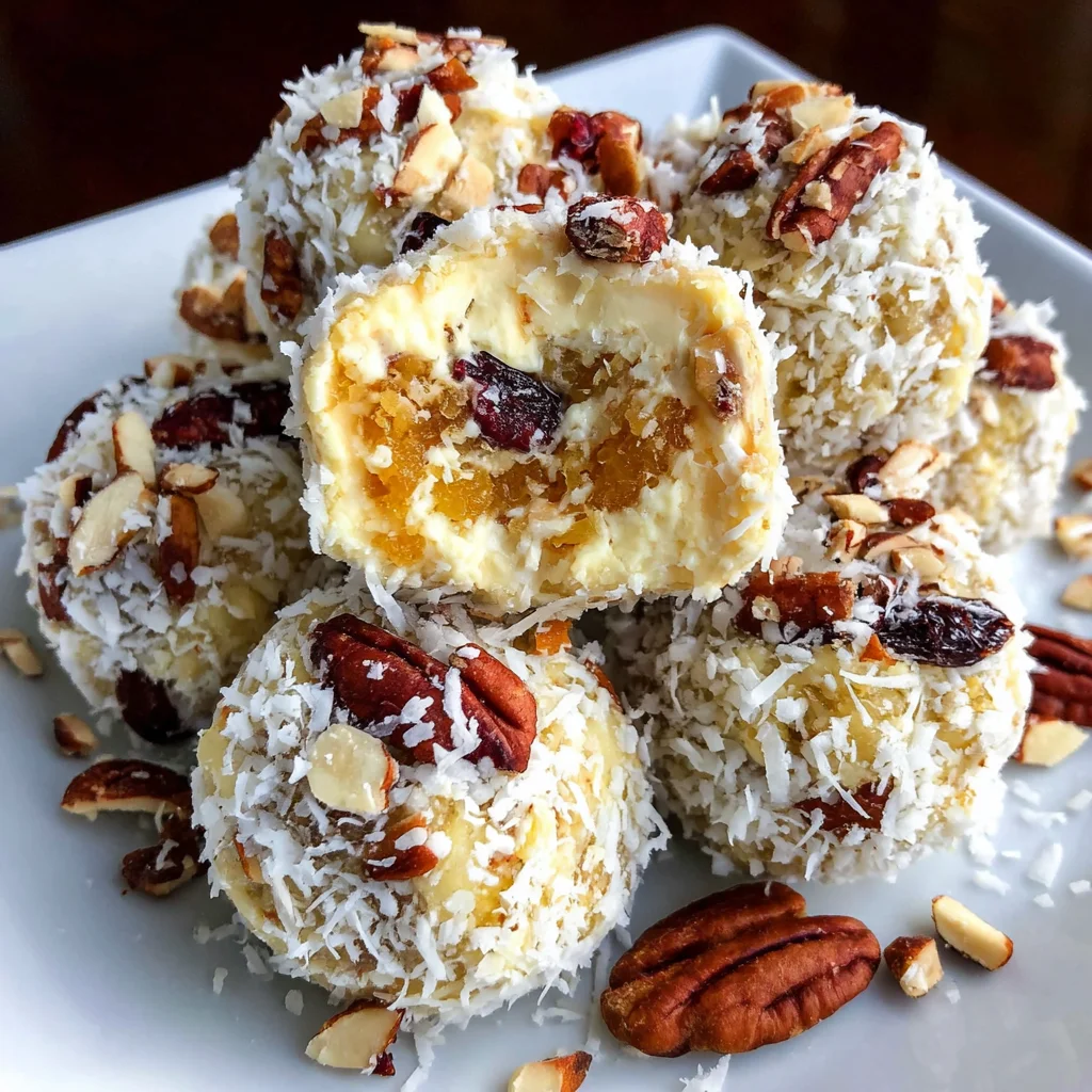 pineapple christmas ballsholiday dessertno-bake recipecream cheese ballstropical christmaseasy holiday treatfestive snackscoconut pecanschristmas party foodquick holiday recipe