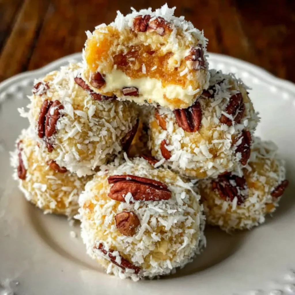 Contains dairy (cream cheese) and tree nuts (pecans, coconut). May contain traces of other nuts depending on processing. For a nut-free version, omit pecans and roll solely in shredded coconut or finely crushed vanilla wafers.