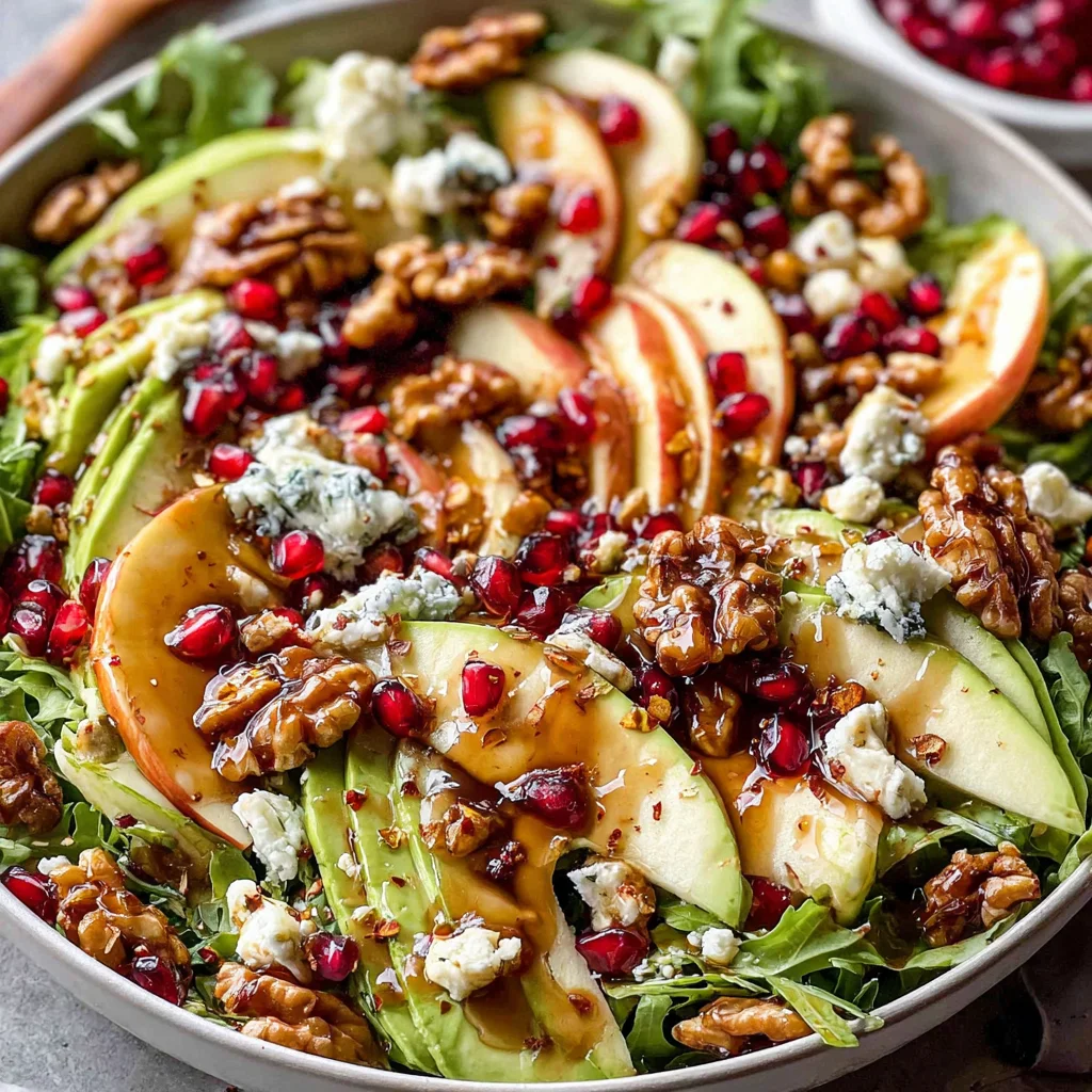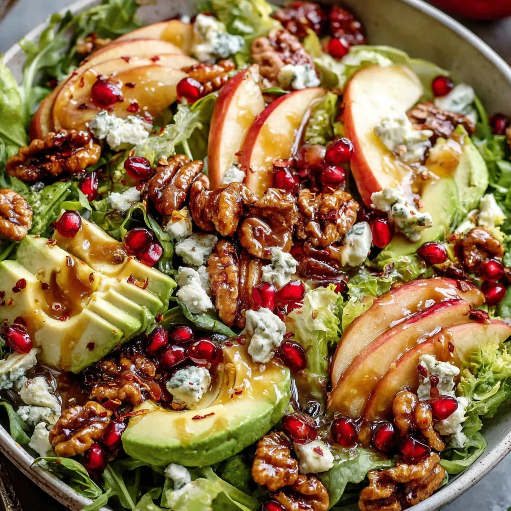 Elevate your holiday table with this vibrant Pomegranate Christmas Salad, a harmonious blend of sweet, savory, and tangy notes. Featuring crisp greens, juicy pomegranate, creamy blue cheese, and crunchy candied nuts, it's beautifully complemented by a zesty homemade honey mustard dressing. This stunning dish is not only a feast for the eyes but also a delightful explosion of textures and flavors that will impress all your guests.