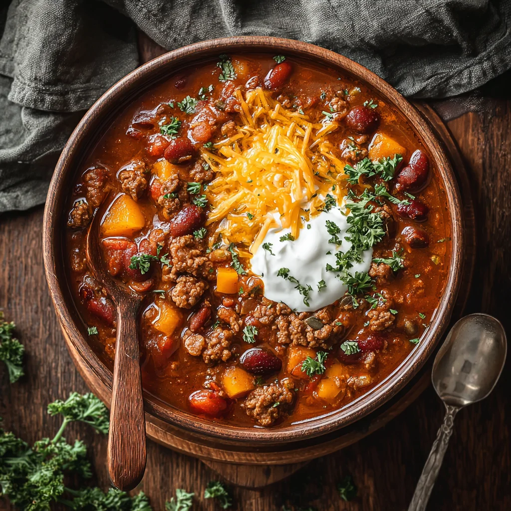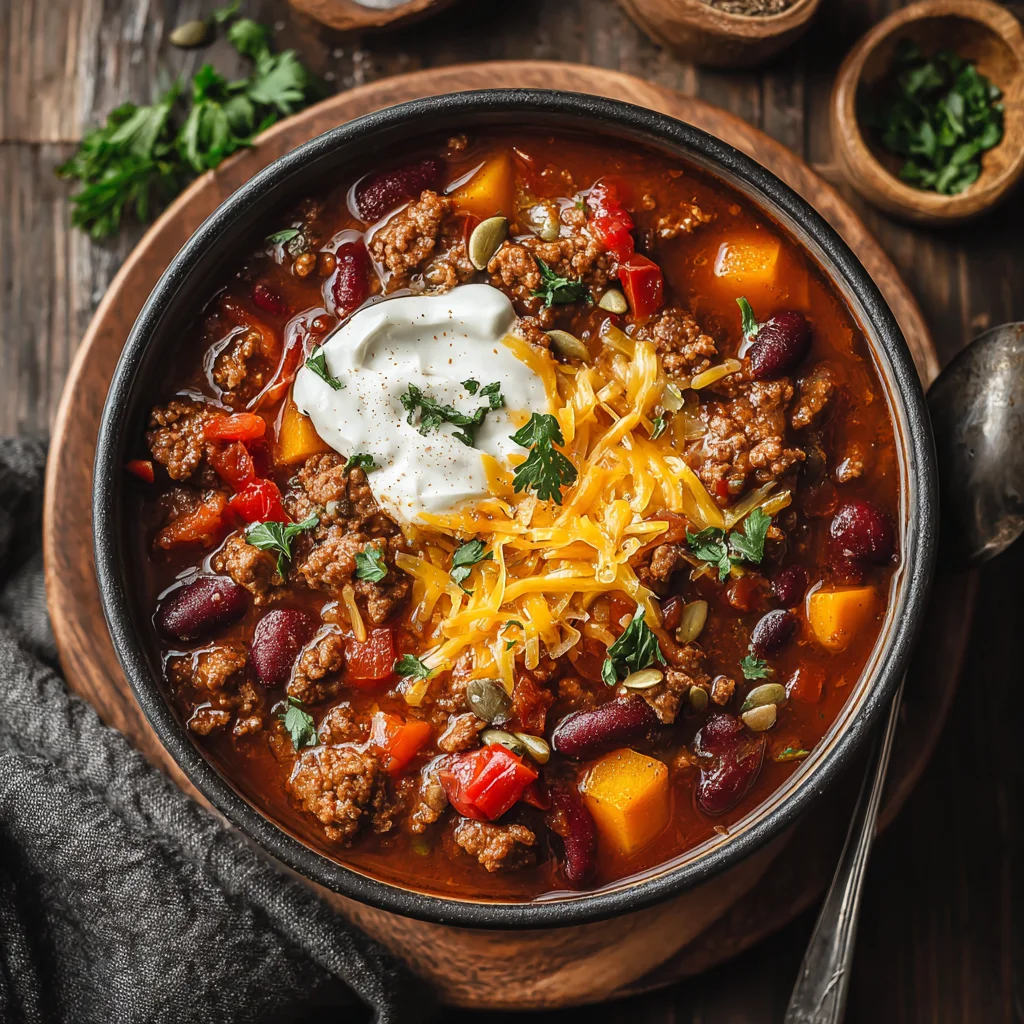 Embrace the flavors of autumn with this hearty and spicy pumpkin chili, a perfect one-pot meal for a cozy evening. Featuring savory Italian sausage, a medley of beans, and the subtle sweetness of pumpkin, it's a dish that delivers warmth and robust flavor in every spoonful. This chili strikes a delightful balance between comforting creaminess and a gentle kick of heat, making it an instant crowd-pleaser.
