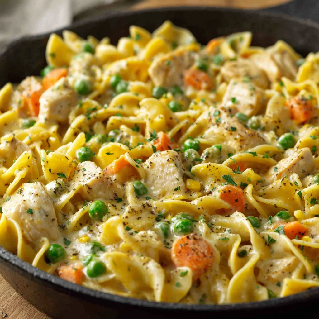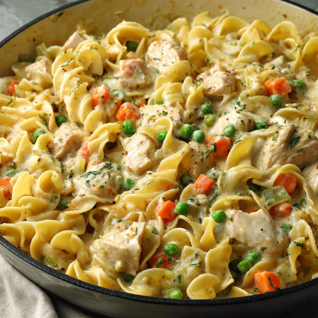 Indulge in the comforting flavors of a classic chicken pot pie, transformed into a convenient and incredibly satisfying pasta dish. This recipe brings together tender chicken, a medley of vegetables, and a rich, creamy sauce, all tossed with perfectly cooked egg noodles. It's the ultimate weeknight meal, offering hearty satisfaction with minimal fuss.