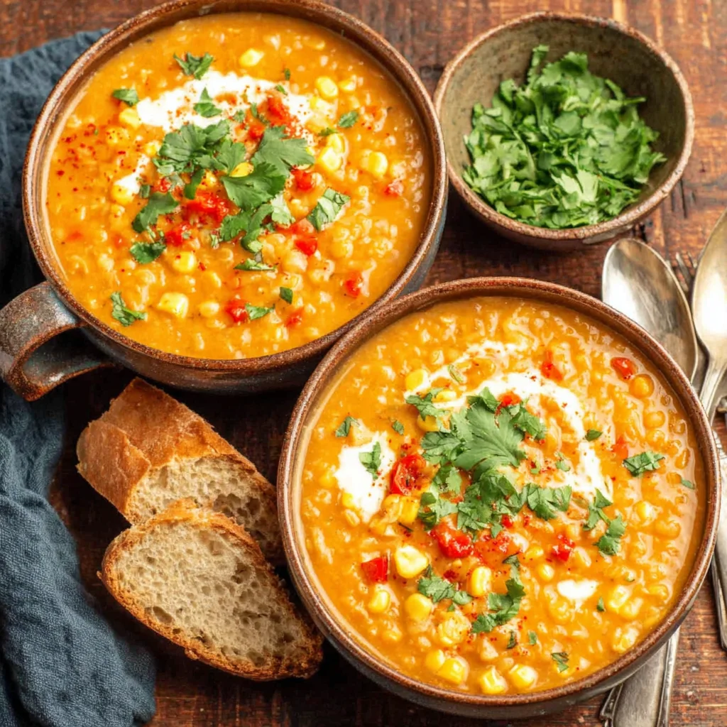red lentil corn chowdervegan chowdervegetarian souphealthy lentil soupcoconut milk soupspicy corn chowderquick dinnerplant-based recipeeasy soup recipeweeknight meal