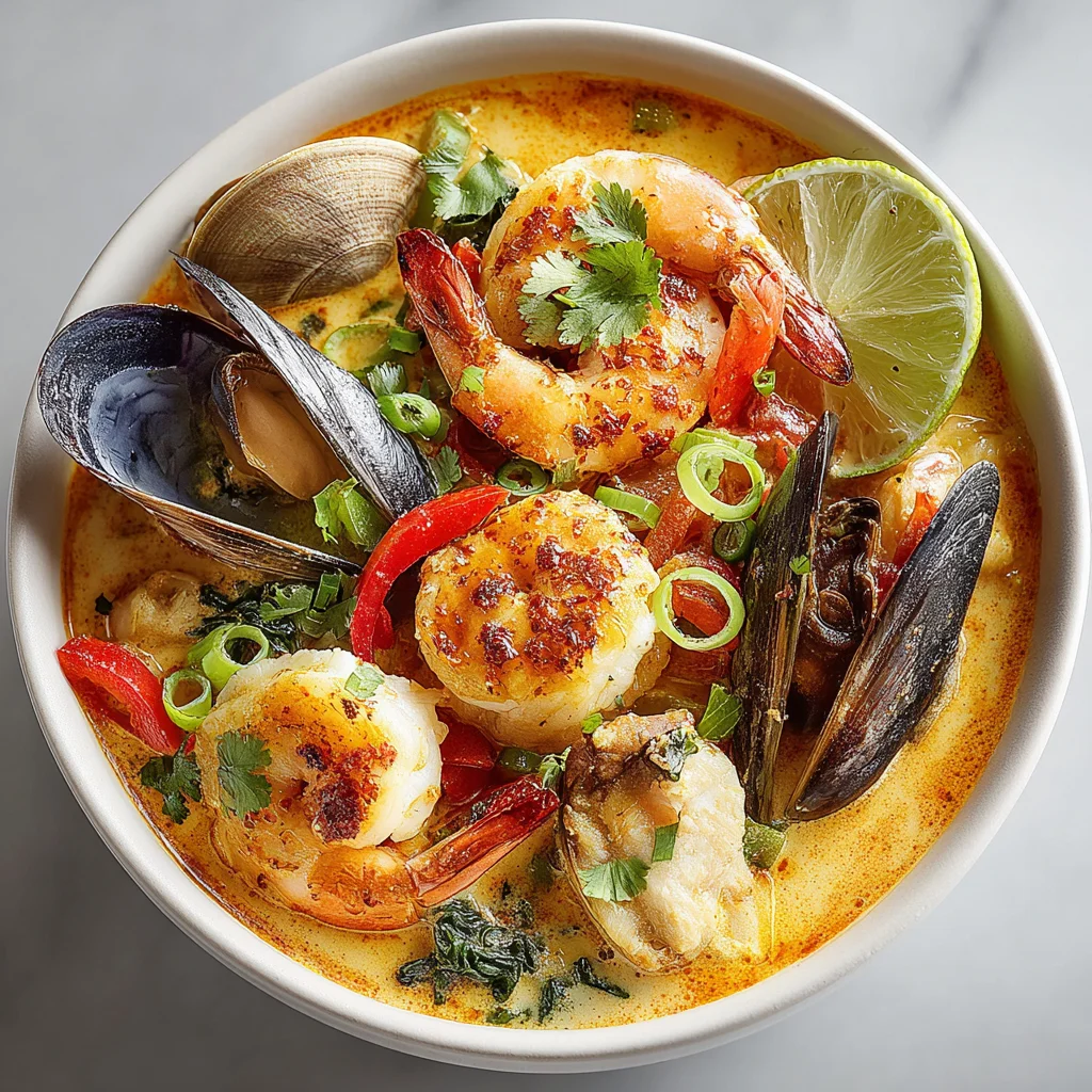 Contains shellfish (shrimp, scallops, clams, mussels) and tree nuts (coconut milk). Always check ingredient labels for hidden allergens. For a non-coconut version, you could try using a dairy-free cream alternative or simply more fish stock for a lighter broth.