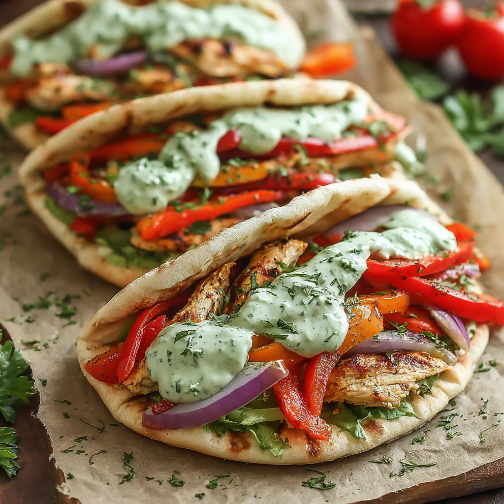 - Assemble the Pitas: Warm the pitas if desired for a softer, more pliable texture. You can do this by wrapping them in foil and heating them in the oven for about 5 minutes, microwaving them briefly, or lightly toasting them in a dry skillet. Carefully slice each pita in half to create pockets, or if using flatbread-style pitas, leave them whole to fold like a taco. Begin assembly by layering shredded lettuce or mixed greens inside the pita. Next, generously stuff the pitas with the cooked sheet pan chicken and roasted vegetables. Add slices of fresh tomato and any other optional toppings such as crumbled feta cheese, pickled onions, or cucumber. Finish by drizzling a generous amount of the homemade herby ranch over the filling. Serve immediately and enjoy the fresh, flavorful combination!