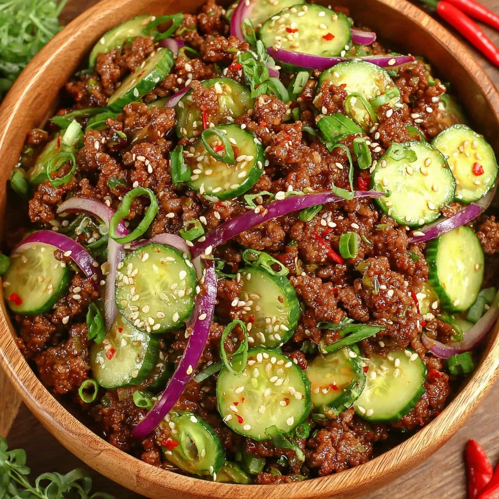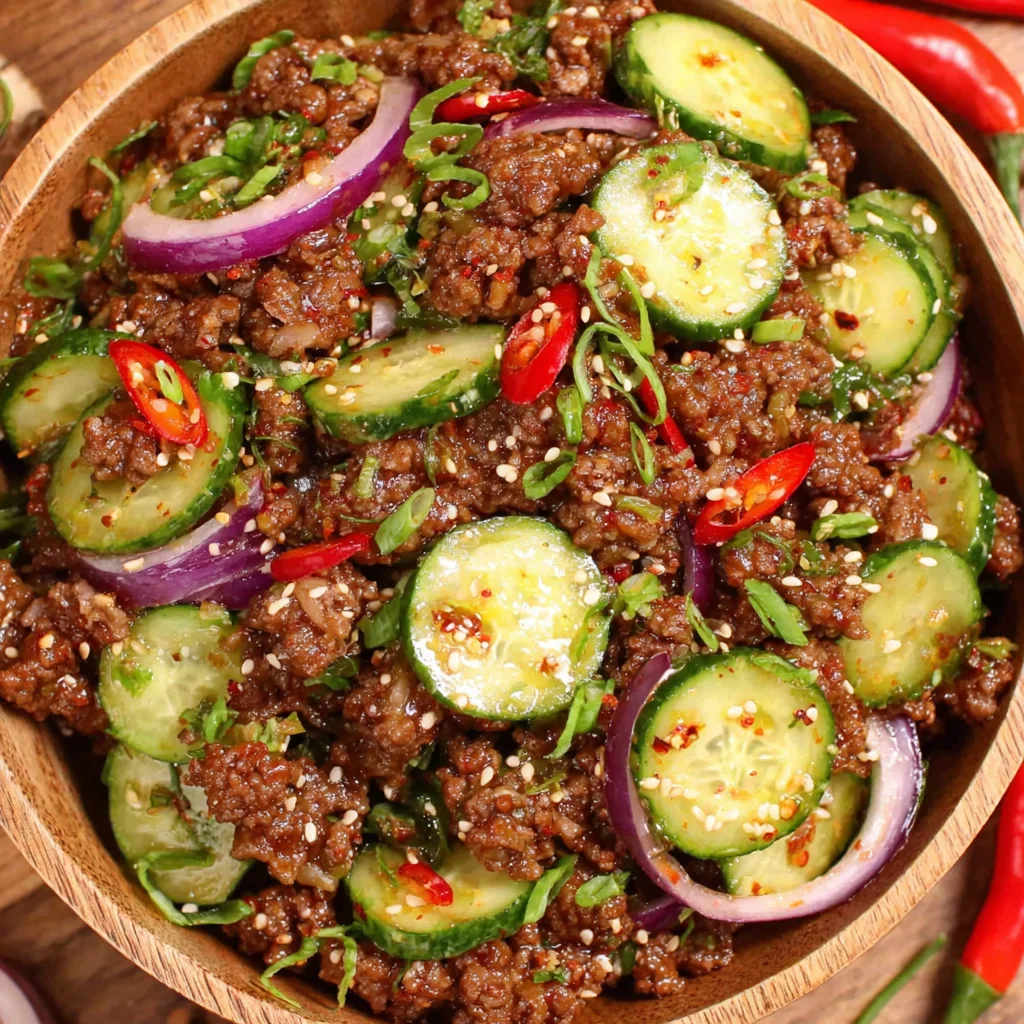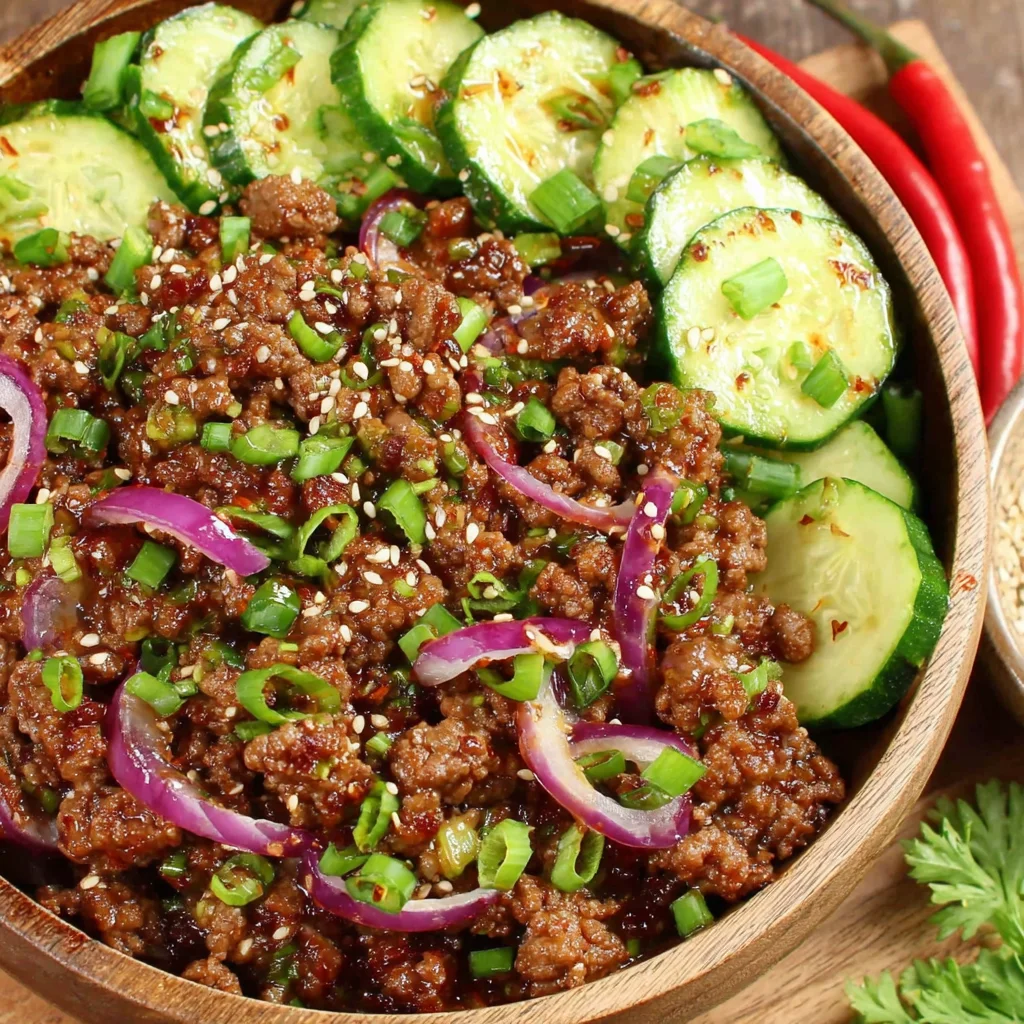 Spicy Korean Ground Beef with Cucumber Salad