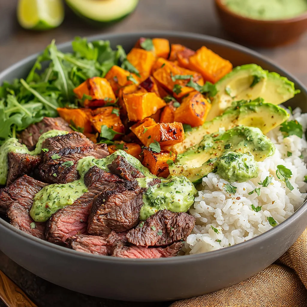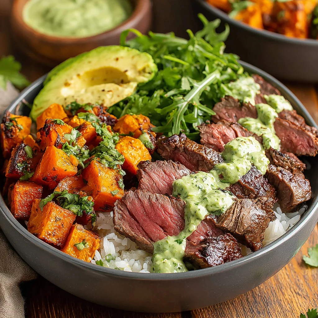 Elevate your weeknight meal with these vibrant Steak and Sweet Potato Bowls. Featuring perfectly seared, marinated flank steak and caramelized roasted sweet potatoes, this dish is a symphony of savory and sweet. Finished with a creamy, zesty avocado-cilantro drizzle, it's a balanced and incredibly flavorful meal that feels gourmet yet is surprisingly simple to prepare.