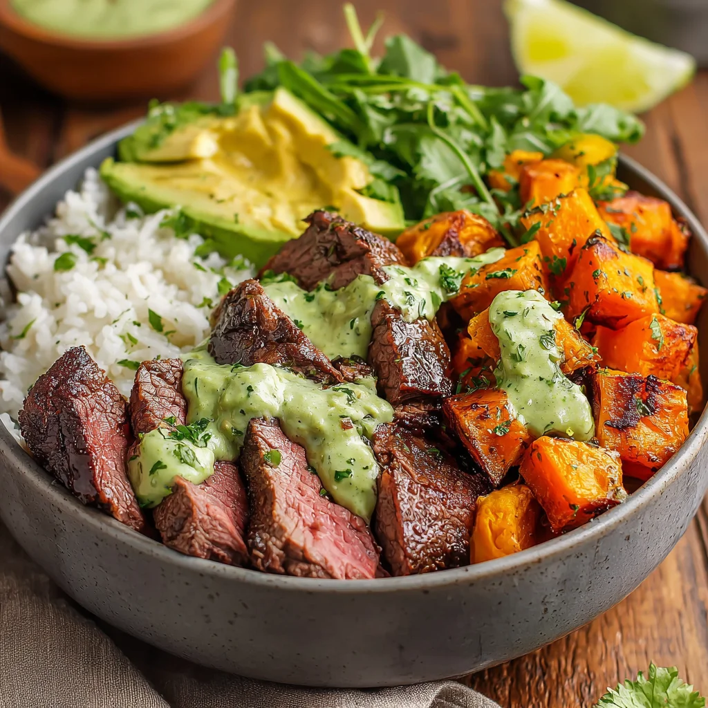 steak bowlssweet potato bowlsavocado cilantro drizzleflank steak recipehealthy dinner ideasquick weeknight mealprotein richgluten free optionhealthy bowl recipelime cilantro sauce
