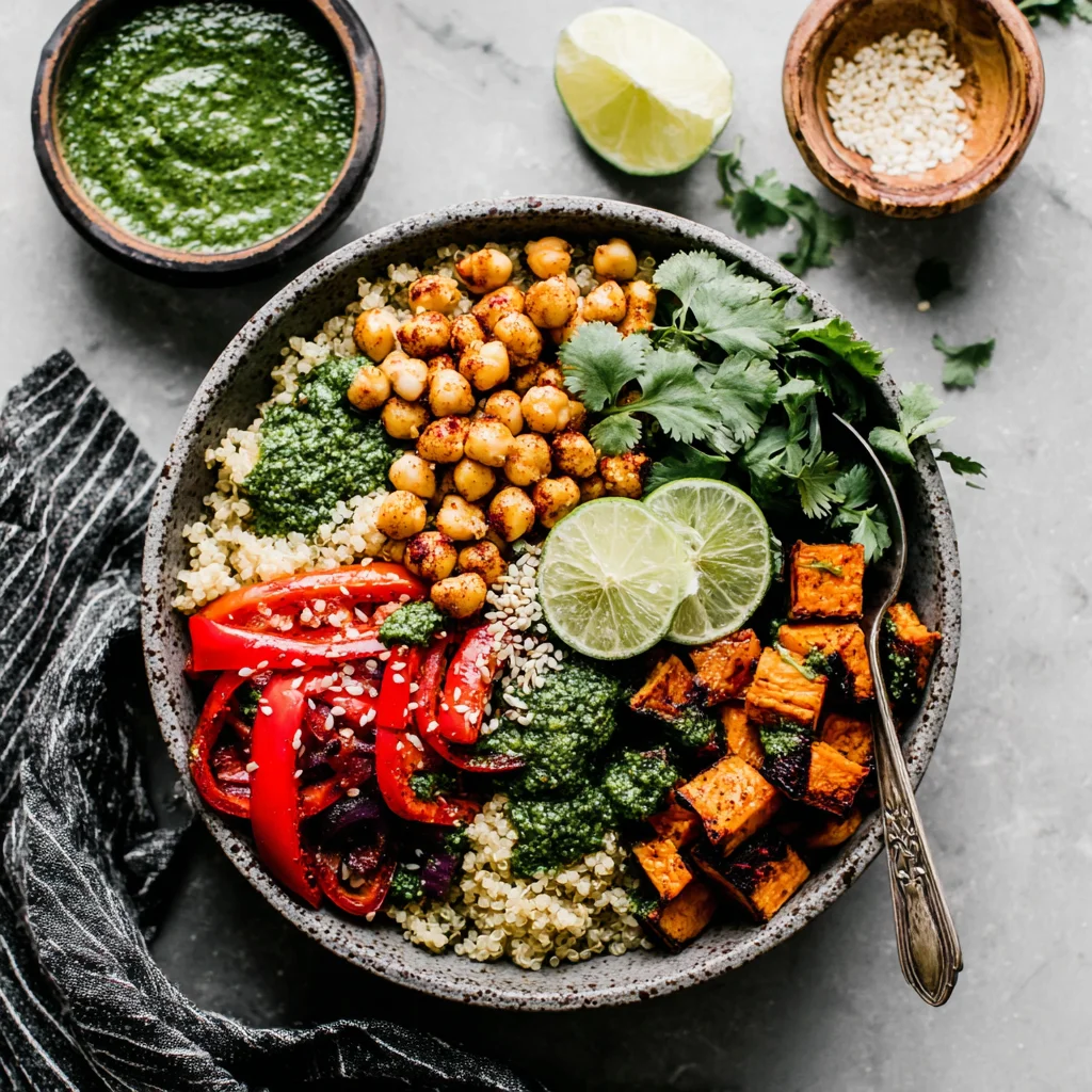 Discover the delightful harmony of flavors and textures in this Sweet Potato Buddha Bowl with Chickpeas. This vibrant, plant-based meal brings together sweet roasted vegetables, fluffy quinoa, and zesty chickpeas, all crowned with a bright Mojo sauce. It's a nourishing and satisfying dish perfect for a wholesome lunch or a light, flavorful dinner.