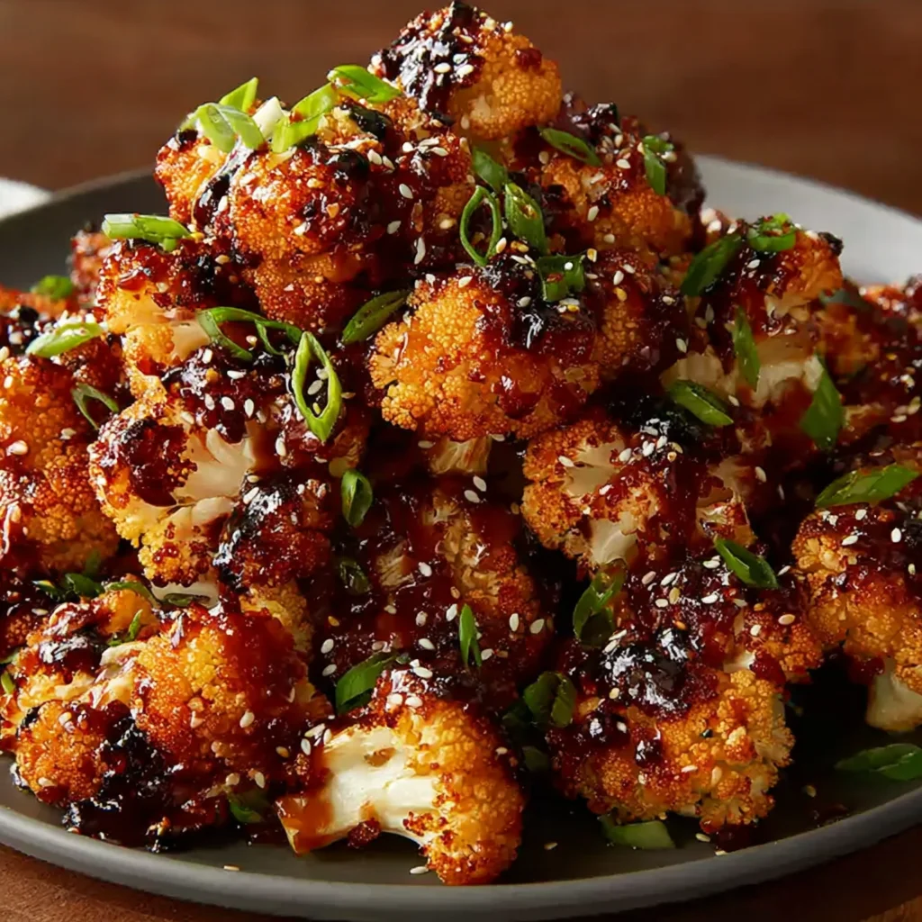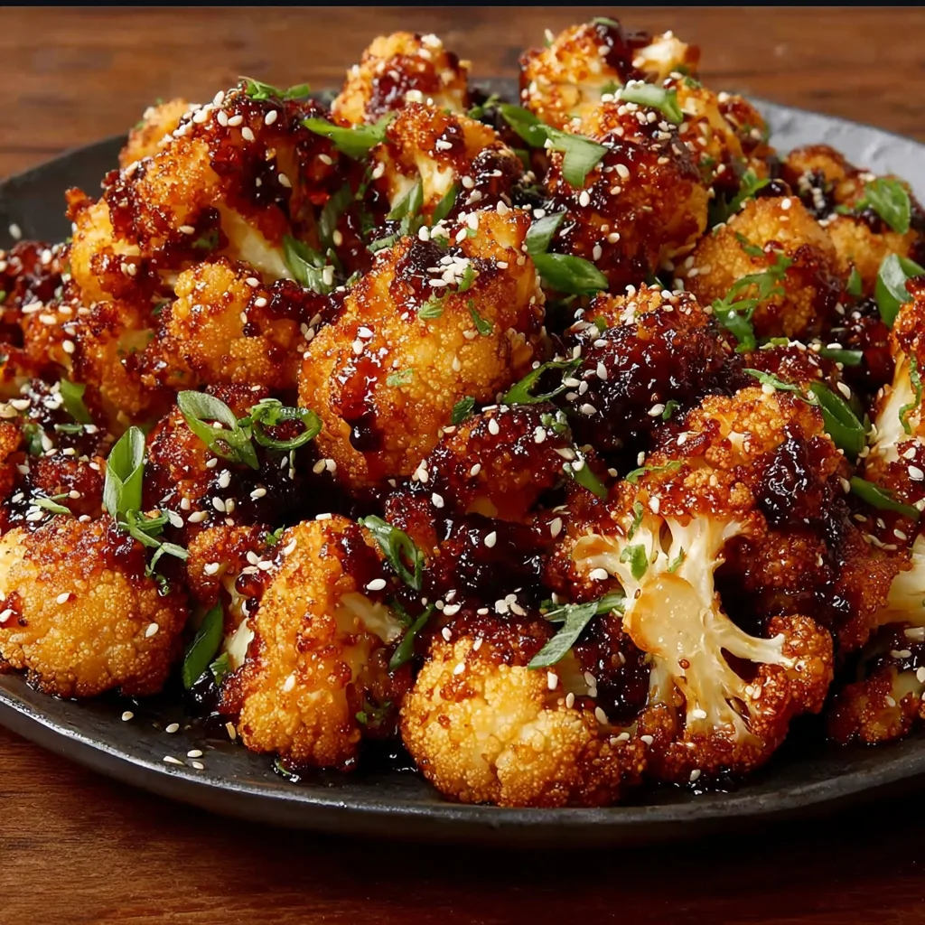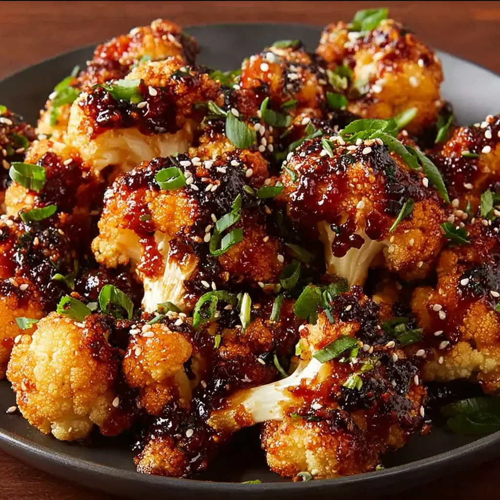 8. Remove the cauliflower from the oven. If desired, garnish generously with sesame seeds and chopped green onions for added flavor and visual appeal. Serve the sweet spicy baked cauliflower immediately while it's warm and the glaze is perfectly sticky.