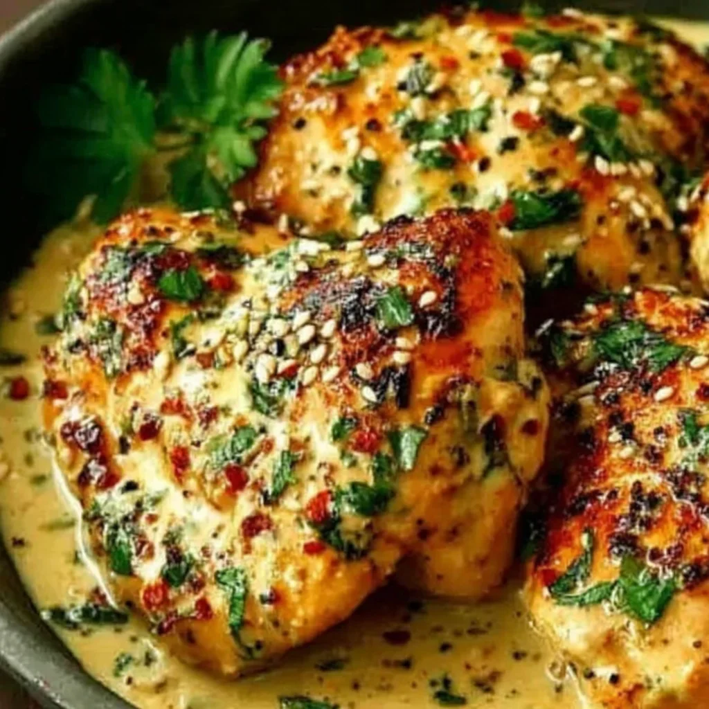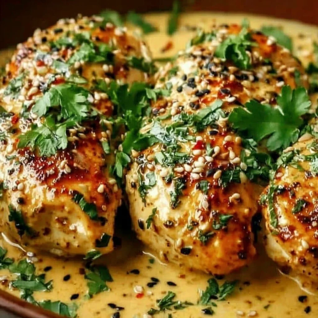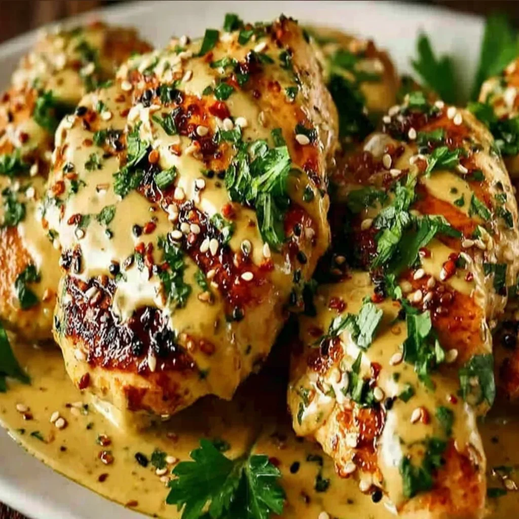 - Just before serving, generously sprinkle the finely chopped fresh parsley and toasted sesame seeds over the warm Tahini Chicken. These garnishes add a burst of freshness, a nutty crunch, and visual appeal, elevating the dish further.